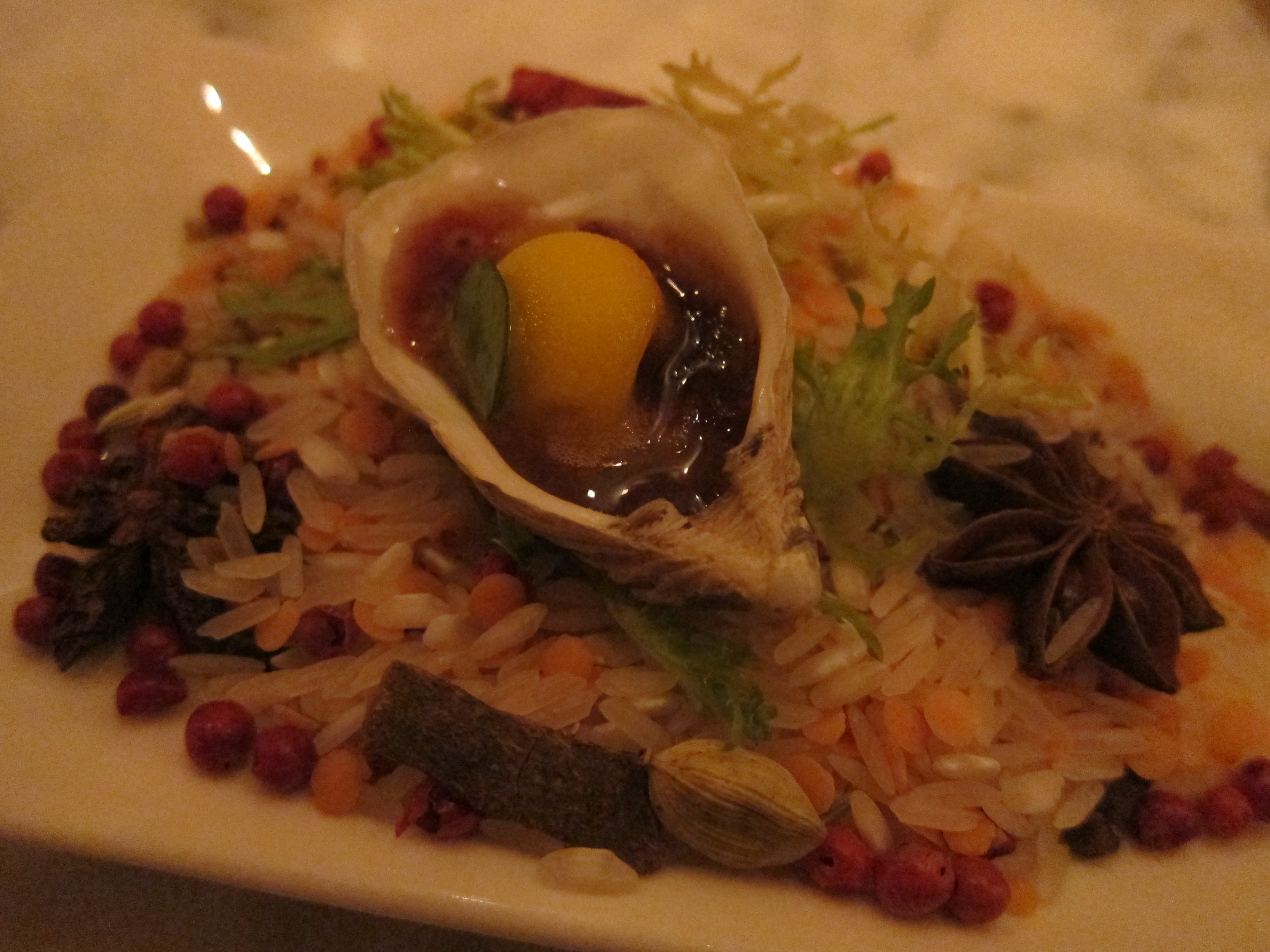 I prefer larger, meatier oysters. This was good, but I think the sorbet and basil stole the spotlight instead of enhancing the flavors of the oyster like a solid mignonette would. Also all the herb and spice accoutrements just seem like a waste.
