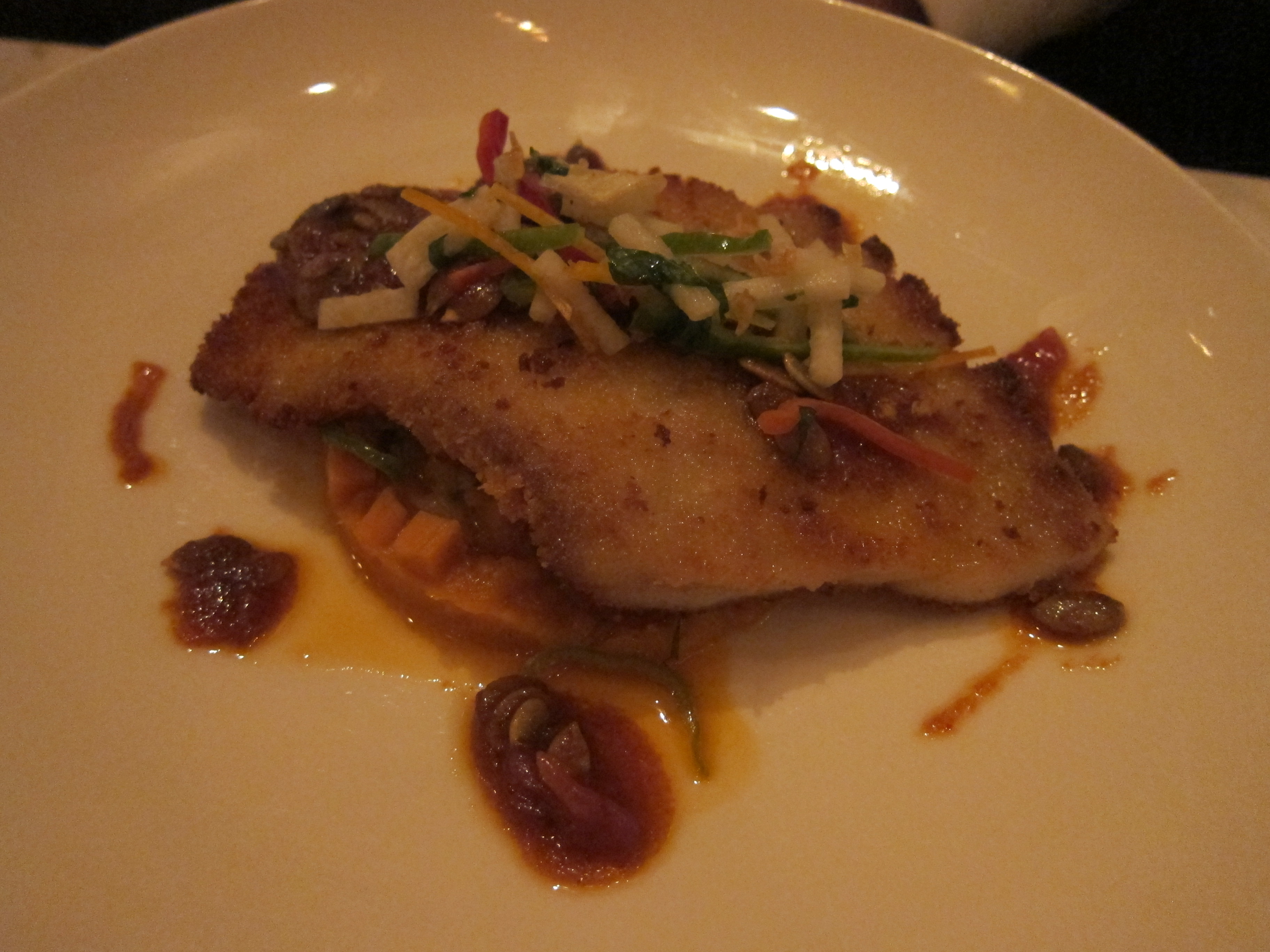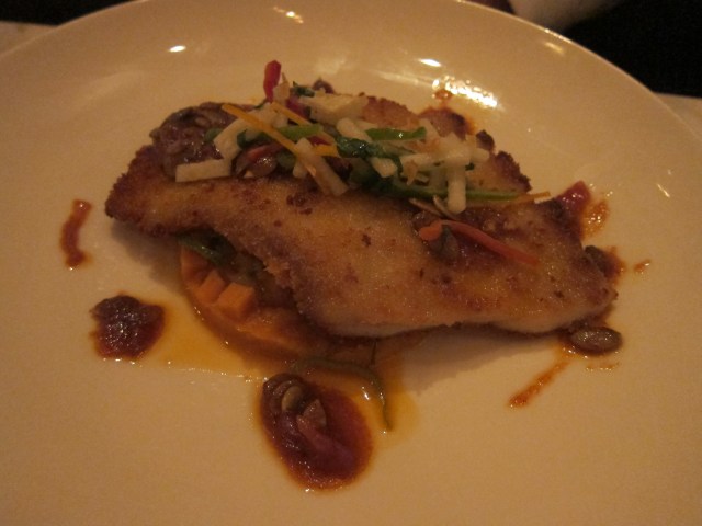 Skate Wing Schnitzel – sweet potato mash, pumpkin seed-kimchi butter