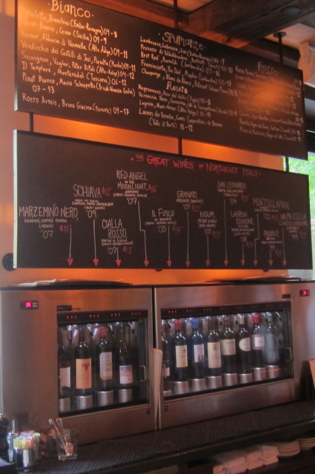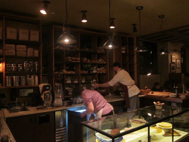 Designed by the Rockwell Group, Maialino tries to emulate the feel of a Roman trattoria but with a few upscale touches. The wooden floors match the wooden wall panels and reclaimed ceiling beams. Framed photographs adorn the walls. Bottles of wine and decanters add warm, finishing touches to the center dividers and shelves. The kitchen is in view and you can see the servers bustling about the open bread station as well. The interior evokes a comfortable and sophisticated but not overly opulent atmosphere. (The Rockwell Group can boast opulent projects as well, such as the Marina Bay Sands Hotel in Singapore. It has also done rustic traditional such as the Ink48 Hotel in New York (home to Print restaurant) as well as a slew of other diverse projects).