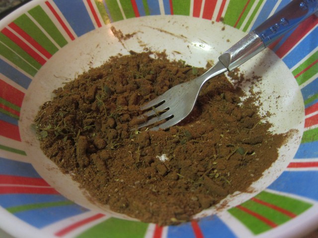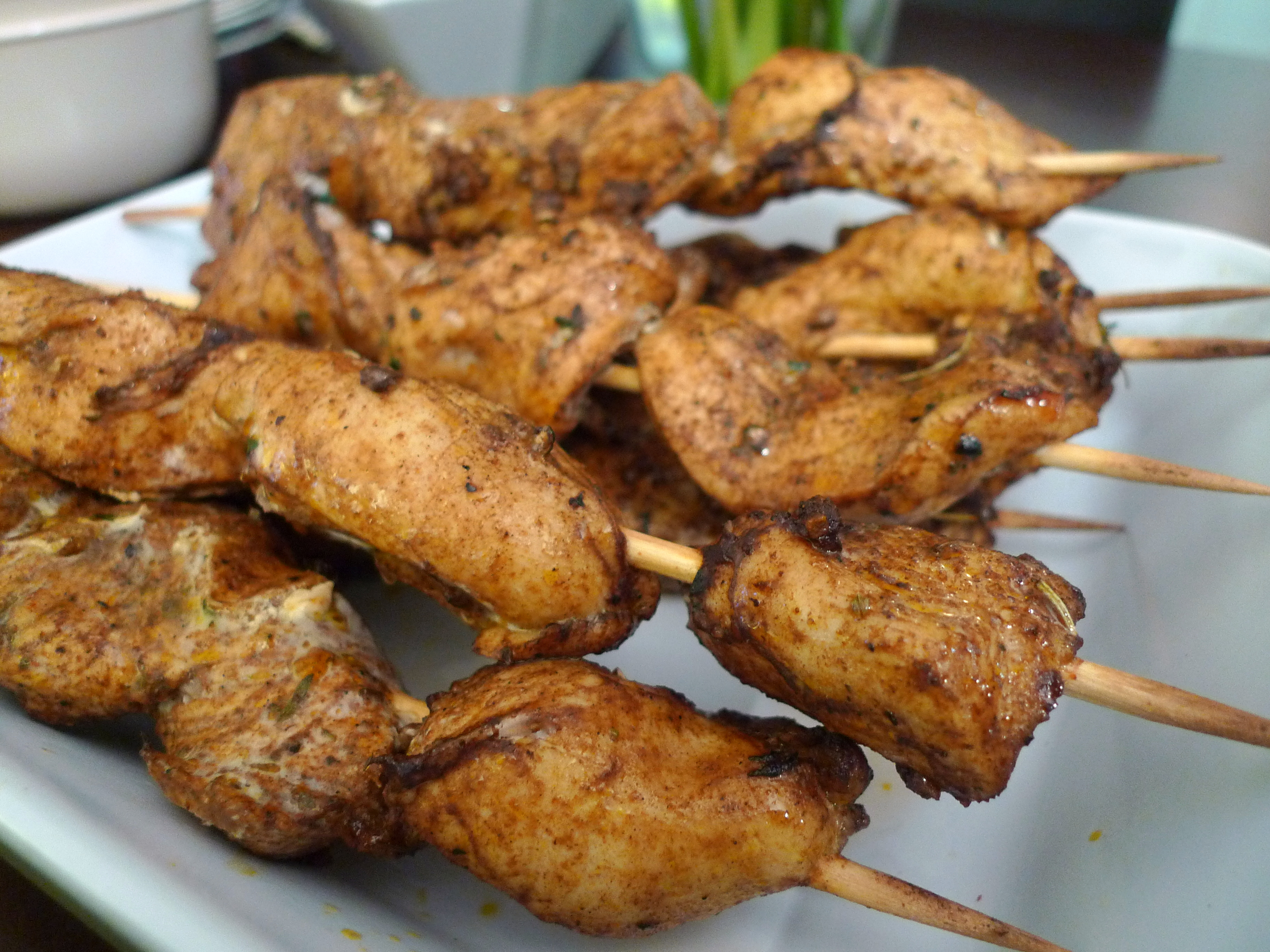 Rub the spice mixture all over the chicken. The chicken can be left for up to 24 hours in the refrigerator in this marinade, if you like. When ready to cook, put the chicken onto the rack of a broiler pan. Broil the chicken for 12 minutes, turning it once or twice during cooking. I’d say the skewers, because of smaller chunks, cooked in more like 8 minutes.