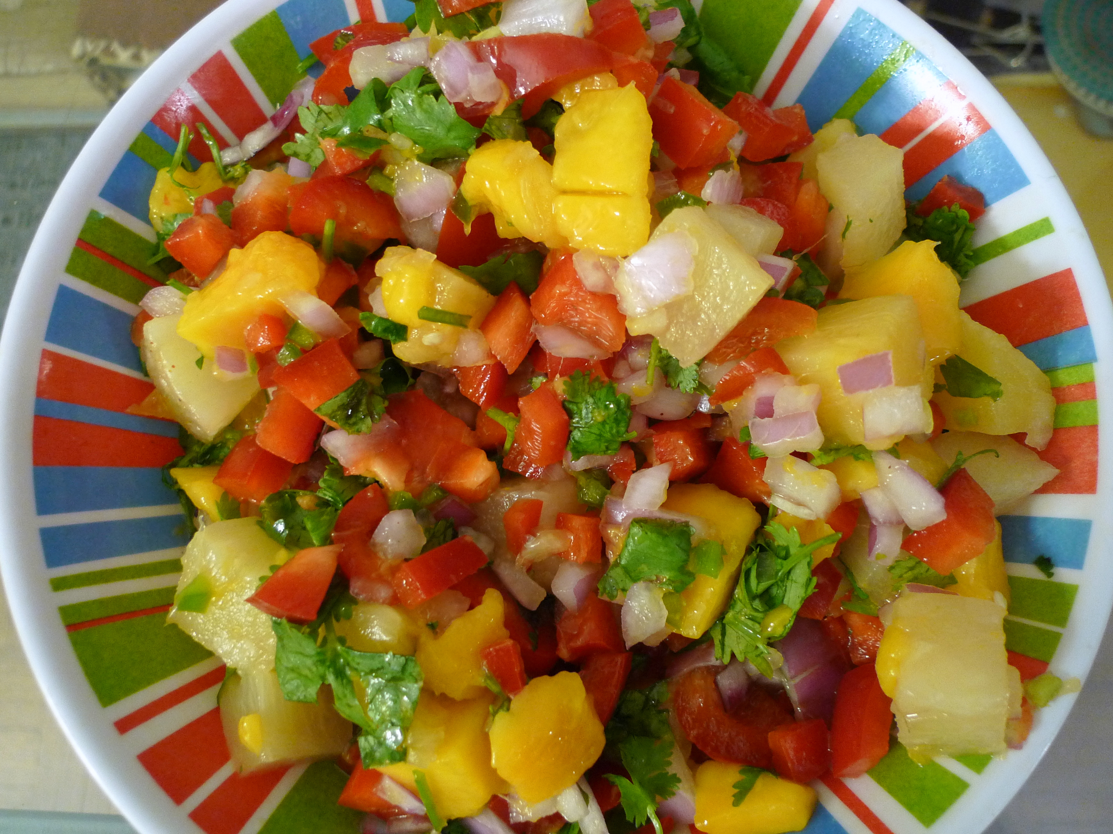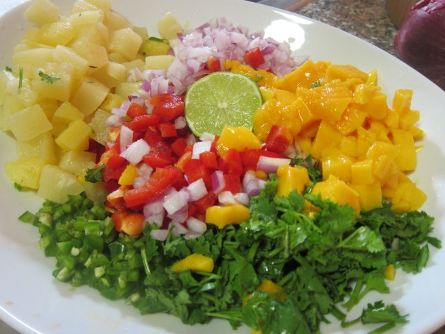 While the chicken cooks, start the salsa. Cut the ends of pineapple into quarters lengthwise, then slice off the strip of hard, pale core that runs along the middle of each quarter.Β Cut criss-cross lines about 1/2 inch apart across each pineapple quarter, cutting all the way down to the skin. Then, starting with the knife about 1/2 inch away from the skin, run the knife between the flesh and the skin to release the small cubes into a large bowl. Since I used canned pineapple (because of my friend’s allergy), all of these steps were done for me! I also sliced up a mango to add more fresh fruit flavor. Add the onion, chile, and red bell pepper, then squeeze the juice of the lime and stir. Season with salt and pepper
