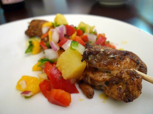 Jen and I were having a few guests over for dinner on a weeknight and needed a delicious, but quick recipe to cook. I found this in my new What to Cook and How to Cook It book, which by the way, is awesome and has amazing food photography. The recipe calls for whole chicken breasts, but Jen and I decided to make skewers to speed up the cooking process and make the dish easier to serve. We also changed up the salsa recipe a bit to accommodate a friend who is allergic to fresh pineapple.