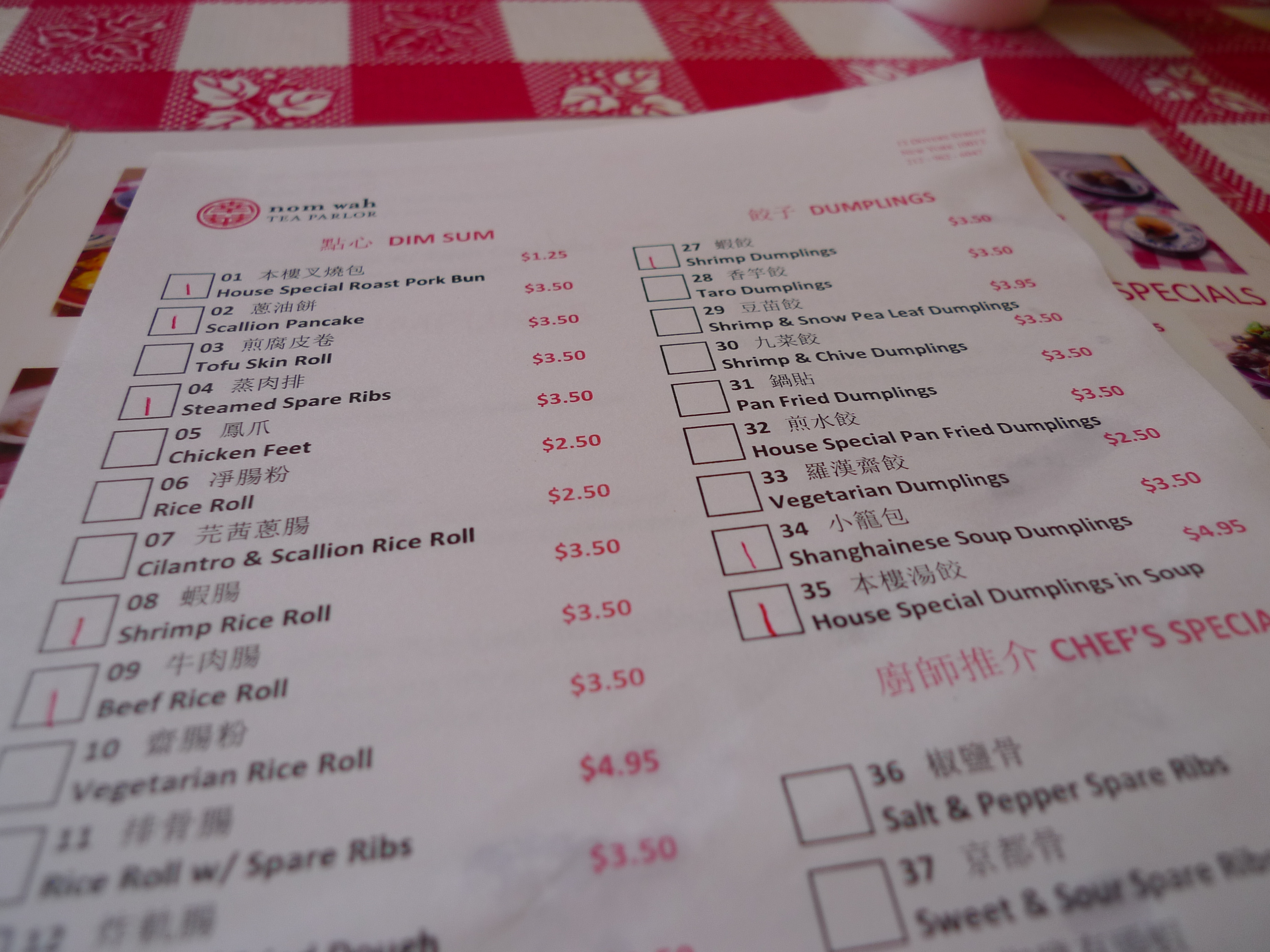 I had been hearing the buzz about Nom Wah Tea Parlor for a while now and I was curious to check out this Chinatown spot that had made its way into mainstream consciousness (aka not just from Asian people).  Nom Wah Tea Parlor first opened its doors on Doyers Street in 1920 as a  bakery and a tea parlor, and it quickly gained recognition for its traditional Chinese sweets, including their almond cookies and homemade lotus paste and red bean filling for moon cakes during the Chinese autumn festival.  Over the years, Nom Wah has changed management (from the Choy family to the Tang family) and address (just one store over) but it still has maintained its old school charm and authenticity as the first and longest surviving dim sum restaurant in Chinatown.