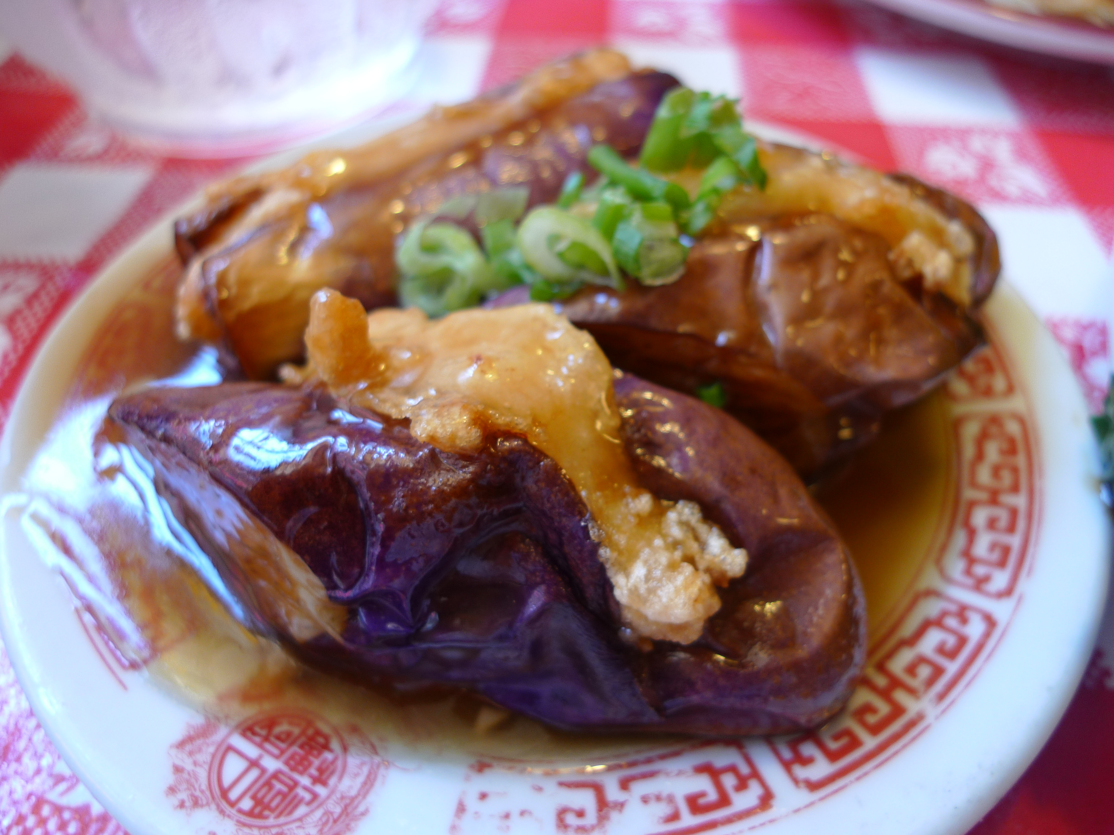 Stuffed Eggplant: eggplants stuffed with deep fried shrimp paste and served with brown sauce and scallions