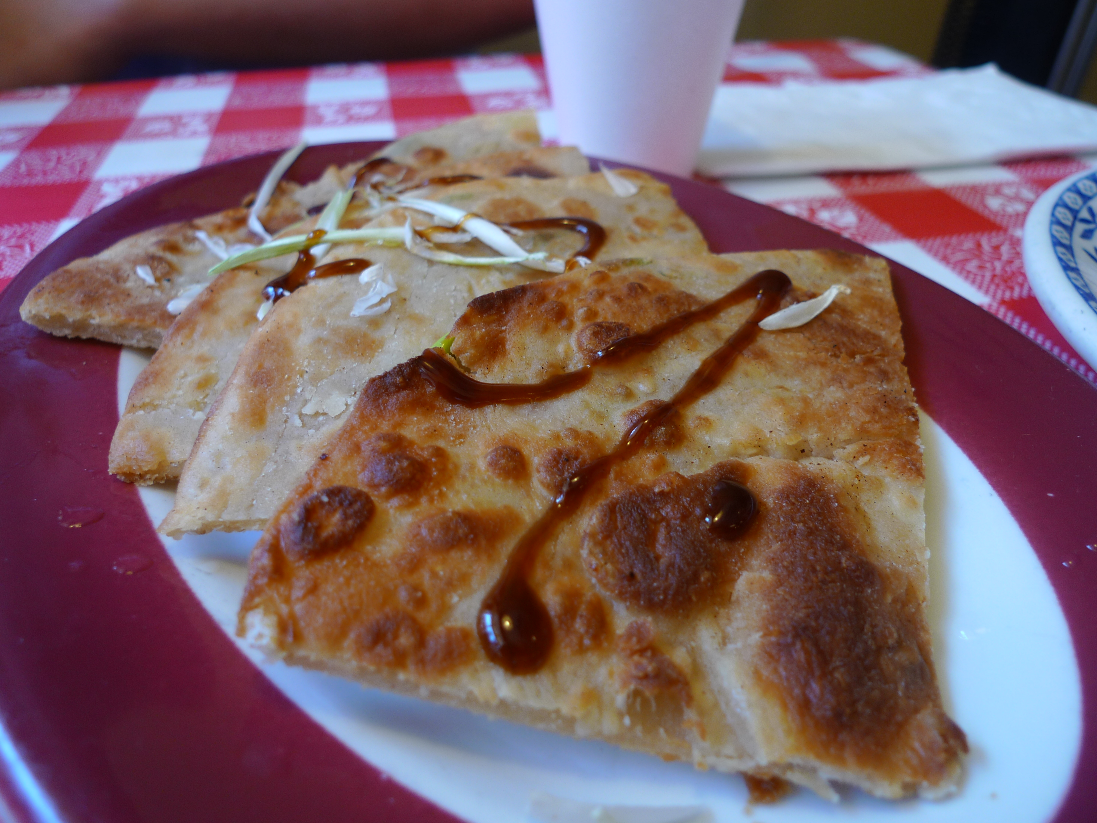 Scallion Pancake: scallions mixed into a wheat flour batter and then pan fried