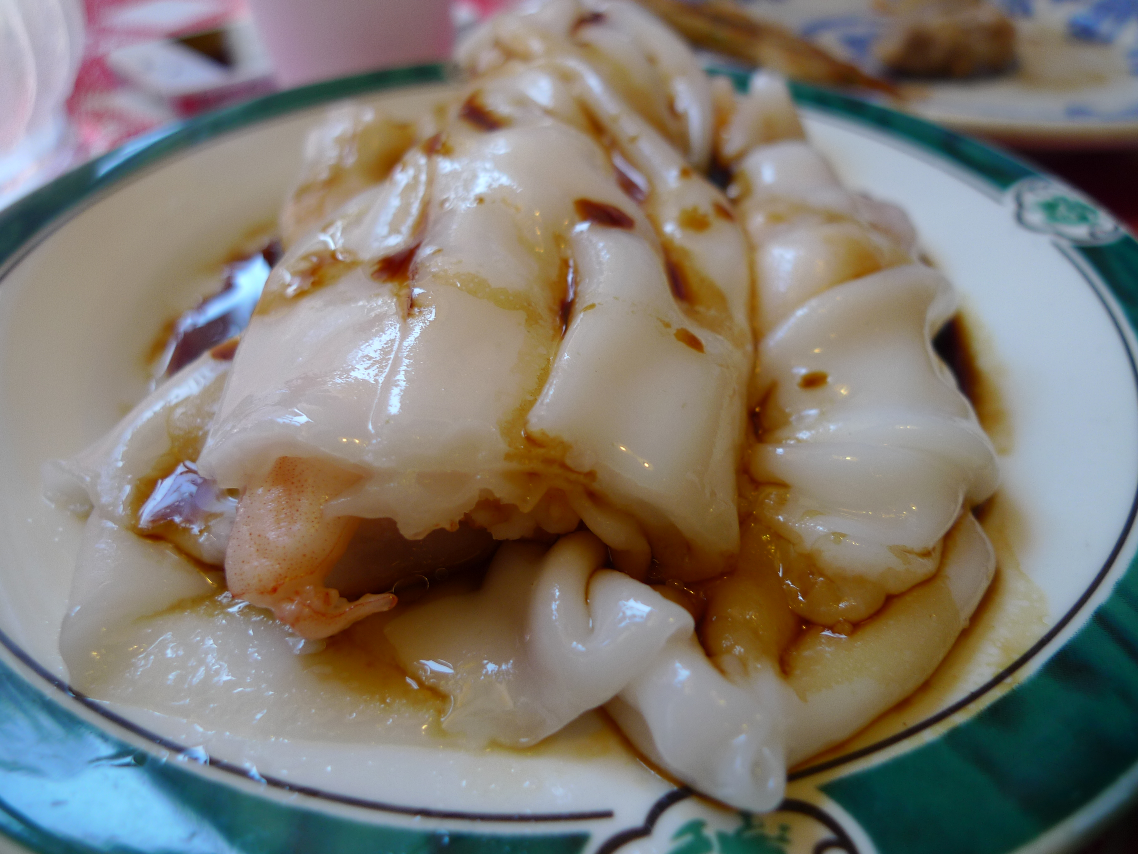 Steamed Shrimp Rice Roll: steamed rice flour noodle with shrimp drizzled with sweet soy sauce