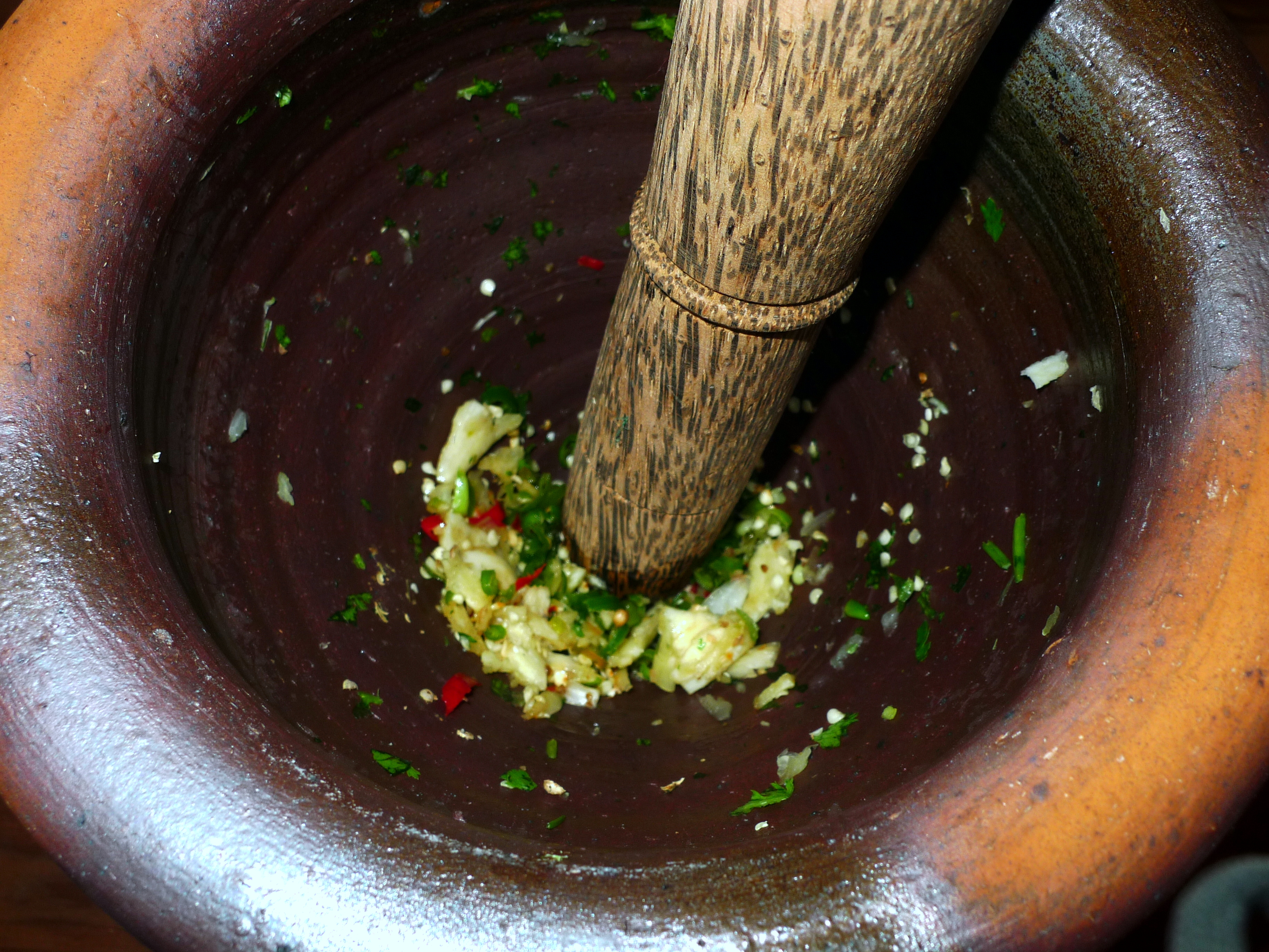 Put the garlic and chili peppers in the mortar and smash it into small pieces with the pestle.