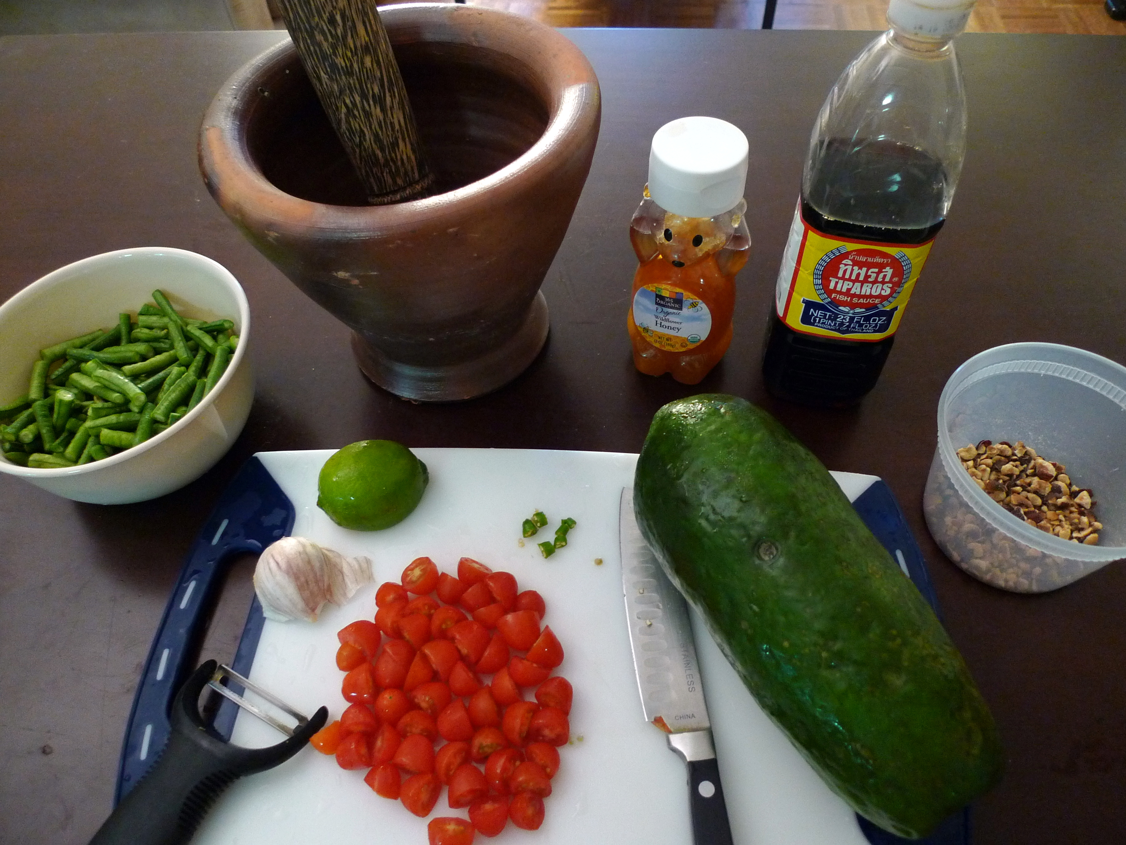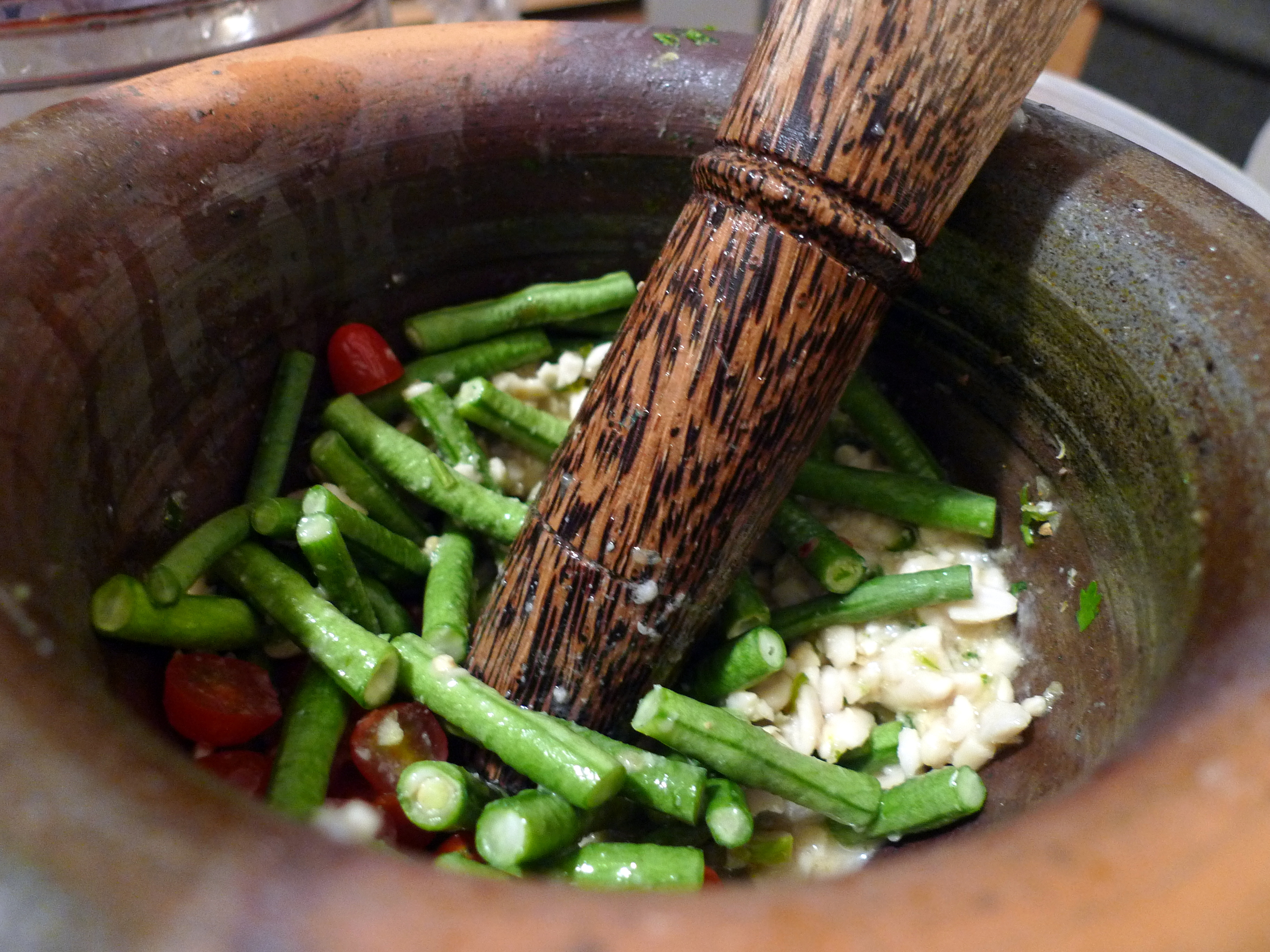 Add these ingredients individually to the mortar and pound it until it all mixes well together: peanuts, palm sugar (honey works too), lime juice, and fish sauce. Add the tomatoes and green beans and bruise slightly with the pestle (I don’t like to overly pound these ingredients.)