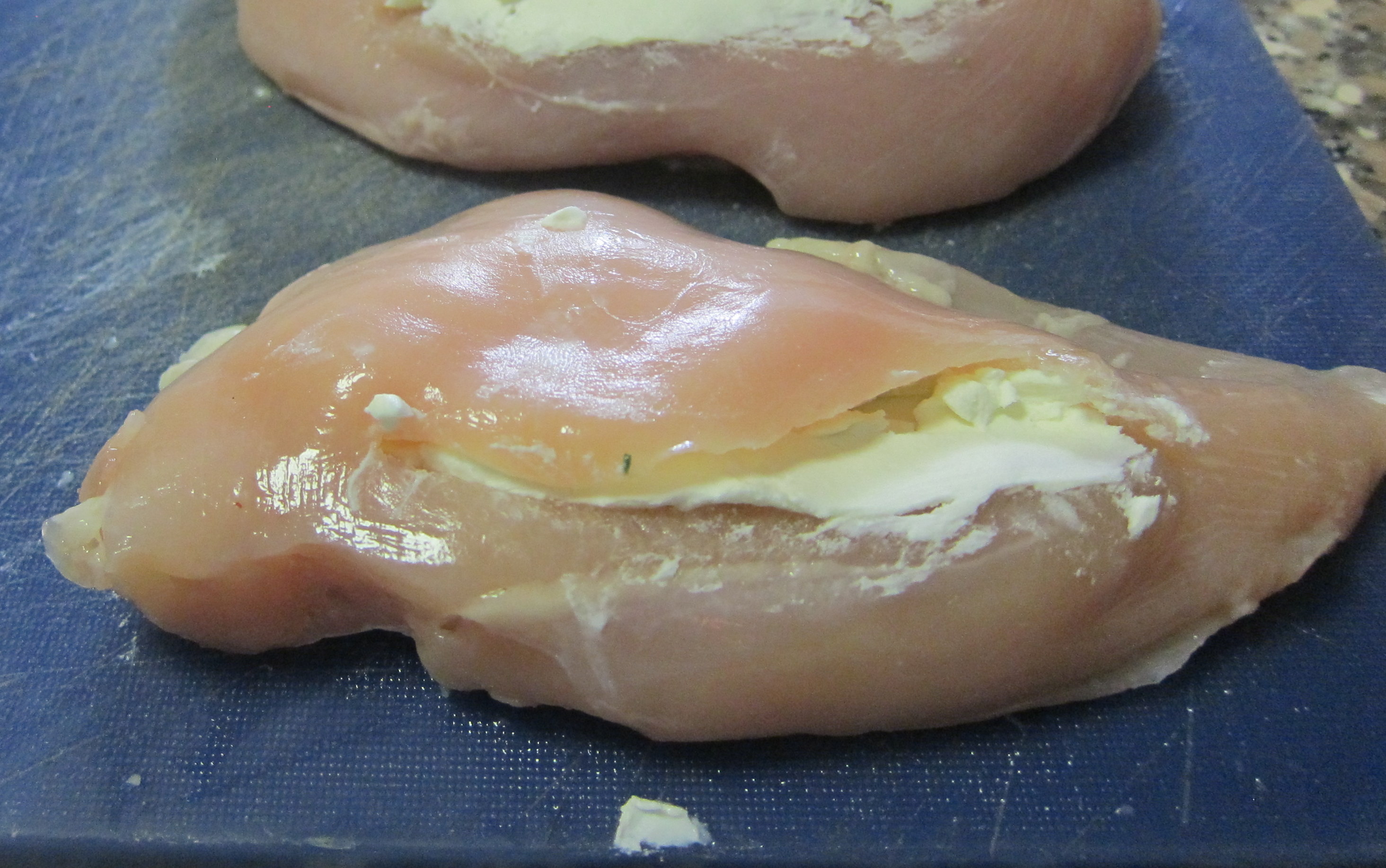 Preheat oven to 400 degrees. Finely chop the needle-shape leaves from the rosemary. Put the chicken onto a cutting board. Using a small sharp knife, cut a slit into the thickest part of each chicken breast, then poke down inside the chicken to make a pocket. Spoon the cheese into each pocket, using your fingers to help, then seal the pocket up as well as you can.