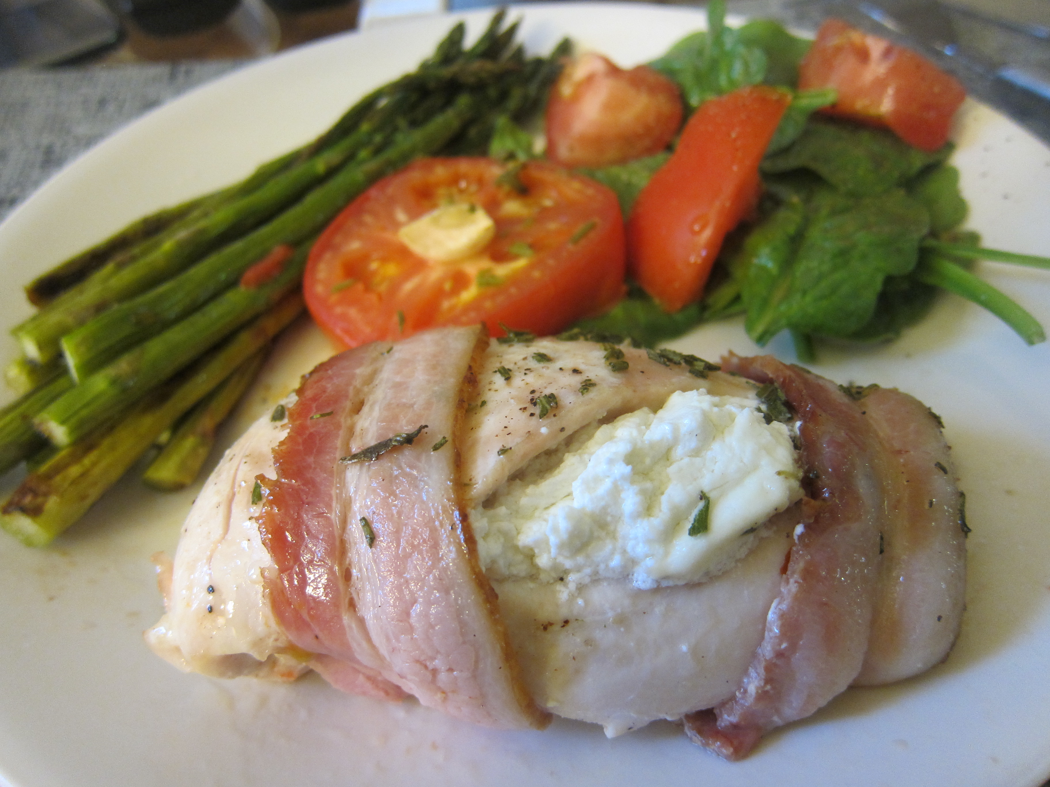 I randomly bought a pack of chicken breasts the last time I was grocery shopping and felt like trying out a new recipe to make them. I consulted my trusty What to Cook and How to Cook It book and found this recipe which I have been meaning to try for a while. It calls for stuffing the chicken breasts with goat cheese (which Jen and I LOVE) and wrapping with bacon (and who doesn’t love bacon?!), but we typically try to eat healthy, so have been shying away from this particular recipe. But I decided to go with it anyway this time and served it simply with Roasted Asparagus and a side of spinach and tomatoes (drizzled with lemon juice), so the sides were quite healthy.