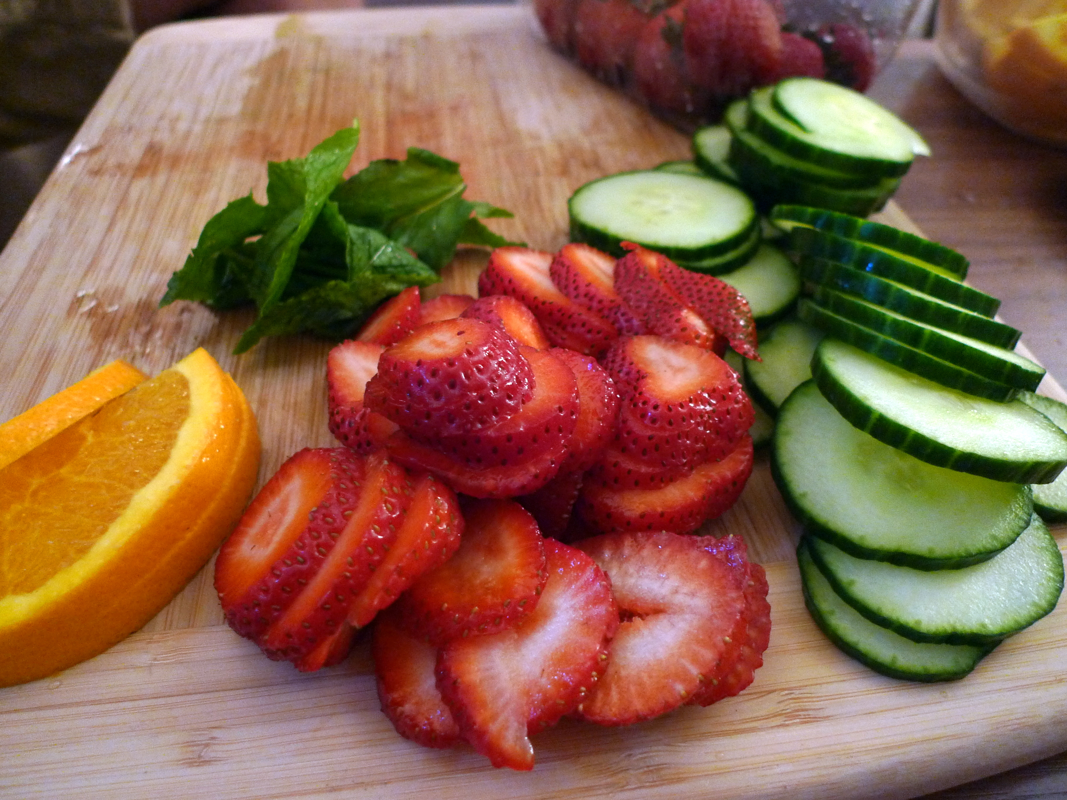 Cut the fruit and cucumbers into slices. Mash up or cut up the mint leaves.