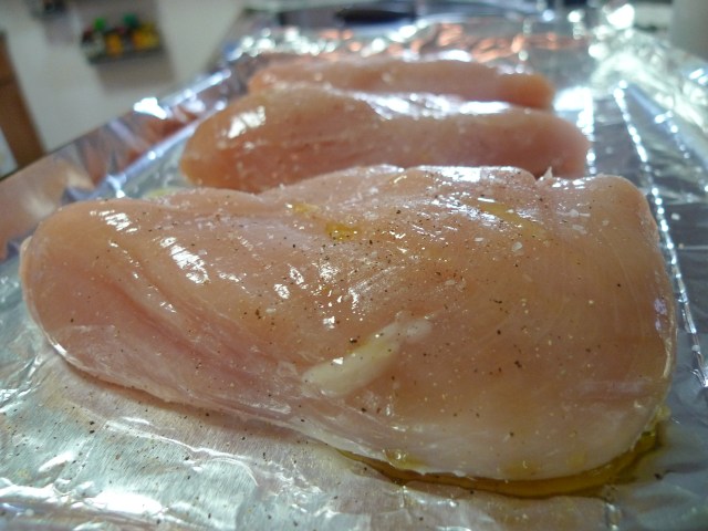 Preheat the oven to 425°F.  Line a baking sheet with foil.  Put the chicken breasts on the foil and drizzle with olive oil.  Sprinkle with salt and pepper and rub until coated.  Pop the chicken in the oven and roast until a thermometer inserted into the thickest part registers 150°F, 15 to 20 minutes.