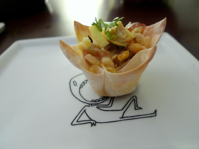 I made this according to the recipe below but with a few adjustments as I think it didn’t need as much curry powder and cumin seeds.  I made this “normal size” and then also “hors d’œuvre” size to fit into baked Wonton Baskets as a fun finger-food dish for a party.  Basically, this just meant I cut all the ingredients up into smaller pieces.  To fill about 24 wonton  baskets, just 1 chicken breast was plenty (so half the recipe below).  This was super easy to put together and very flavorful — I highly recommend as a great party appetizer idea! For another version of a chicken salad, check out this Chilean Palta Reina.