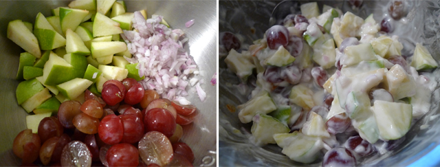 Meanwhile, build the salad: Toss the shallots, apple, grapes, lime juice, yogurt, 1/2 tsp salt and the remaining 1 T marmalade in a large bowl.