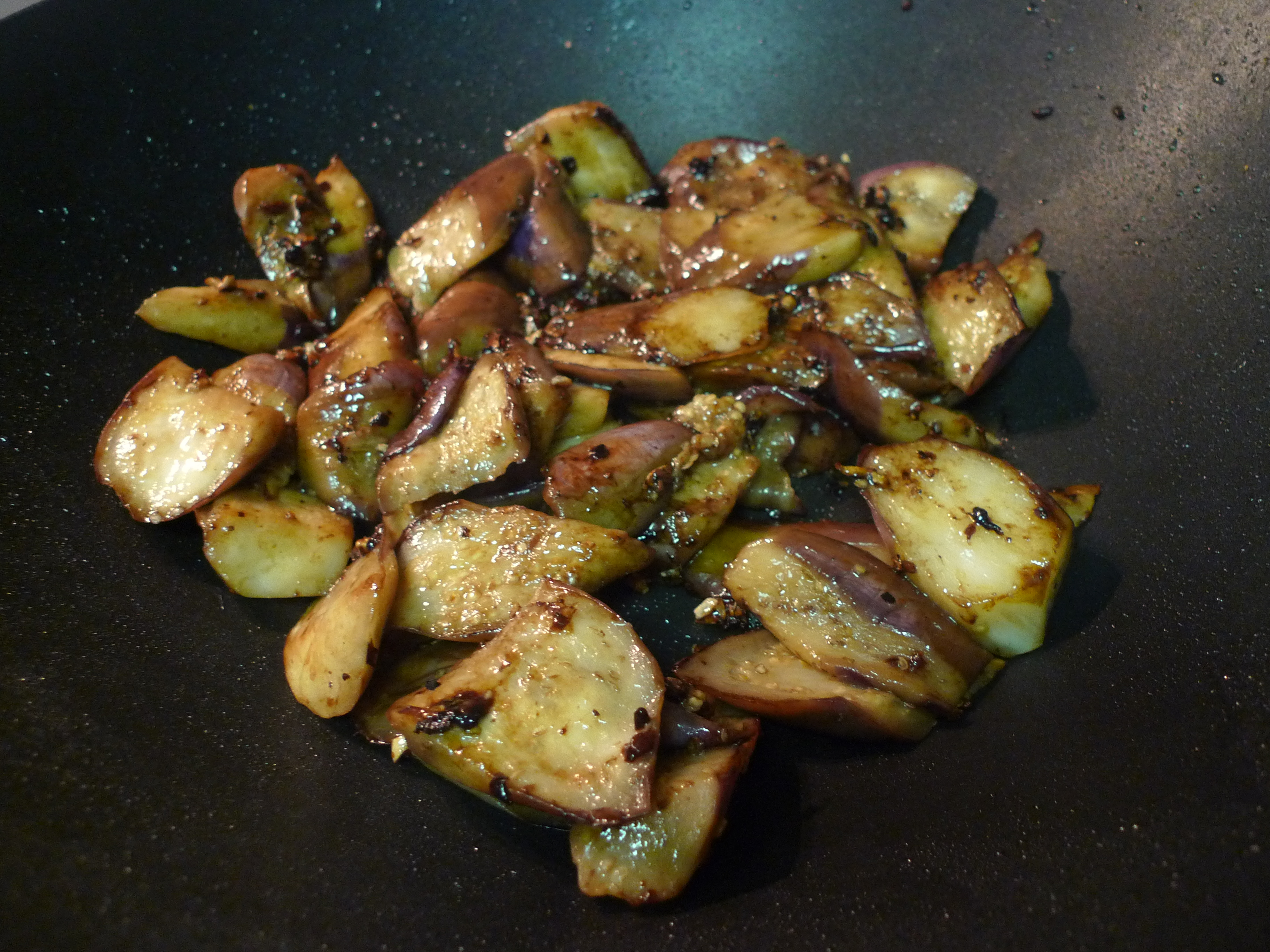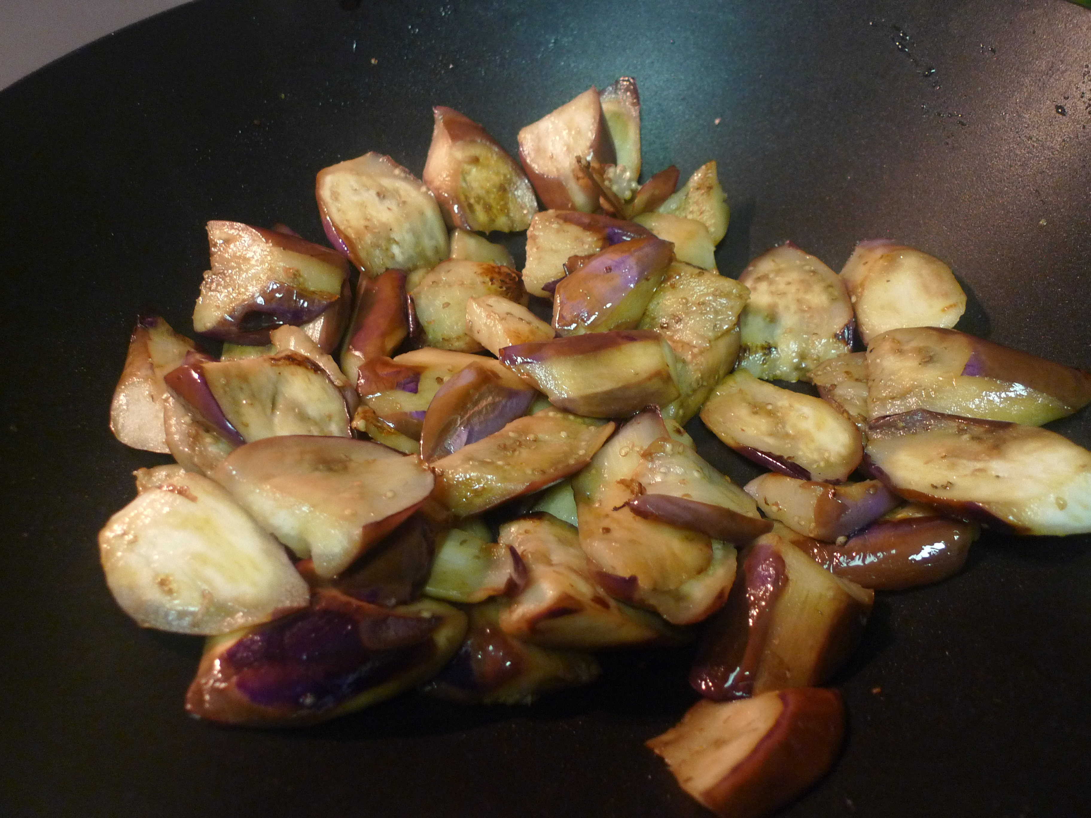 Remove the stalk from the eggplant and without peeling, cut into thumb sized slices. Heat vegetable oil in a wok or large frying pan until very hot. Add the eggplant, turn the heat to low, and stir fry until the eggplant is soft (about 3 minutes). Press the eggplant to squeeze out the excess oil — eggplants are notorious for absorbing immense amounts of oil like a sponge. Remove the eggplant from the pan to a paper toweled covered plates to drain and set aside.