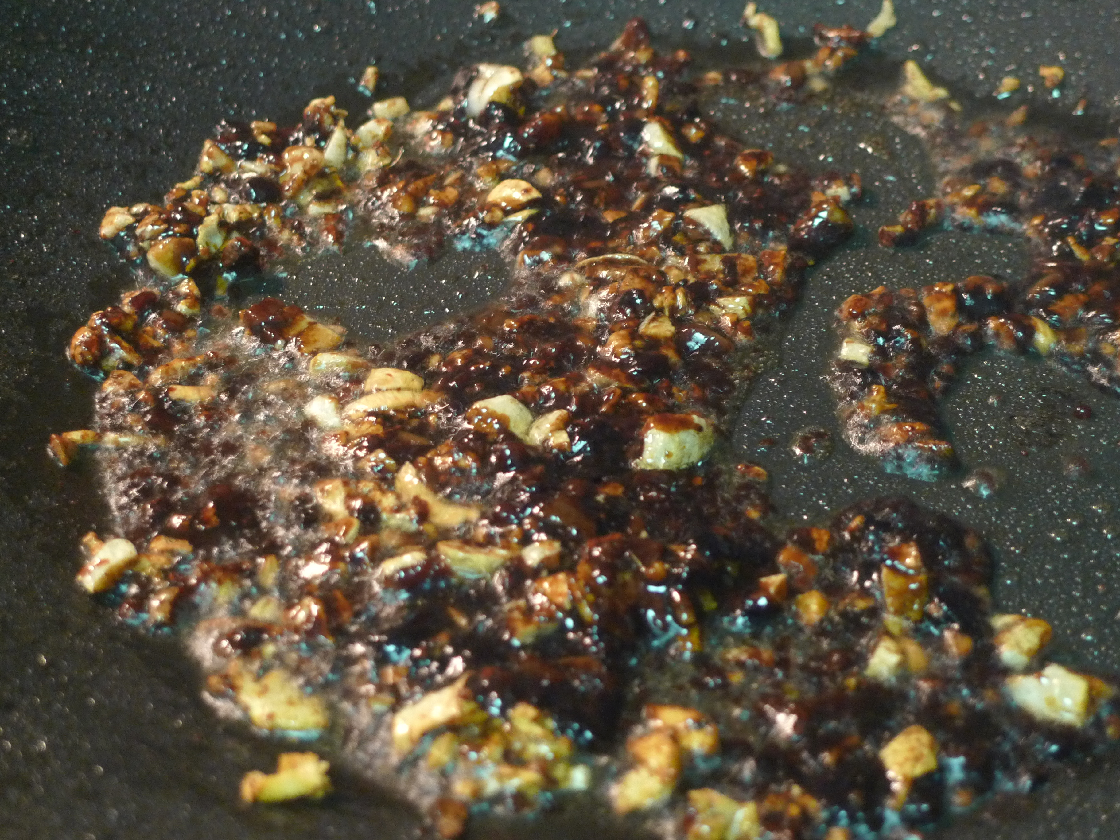 In the same wok, add chopped garlic, ginger and hot bean paste and stir until fragrant. Add the soy sauce, sugars, salt, and soup stock and bring to a boil.