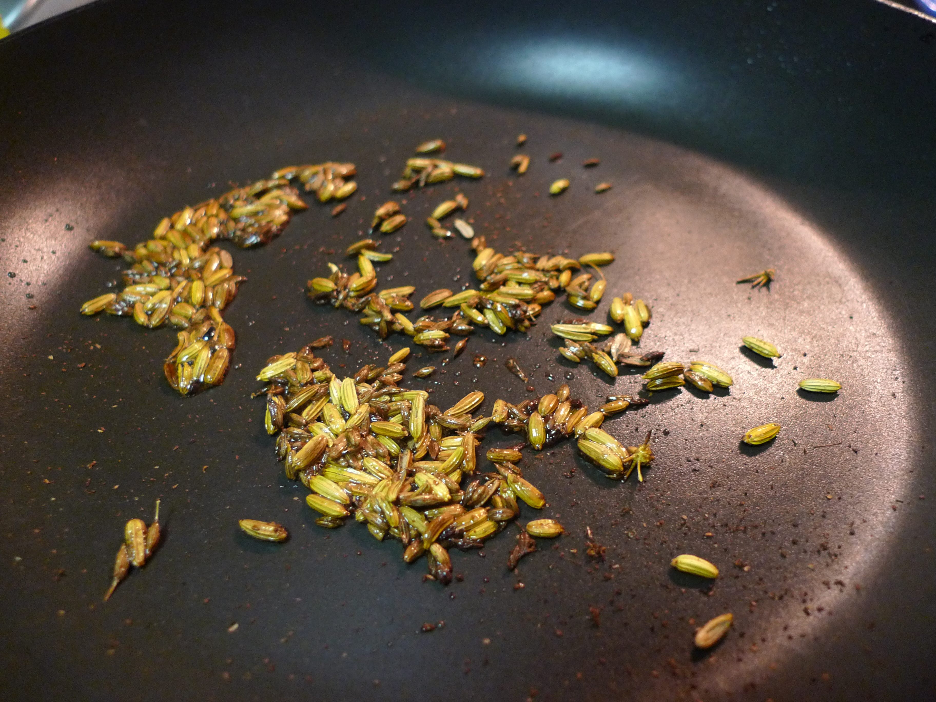 In a small skillet, heat a little oil gently and add the spices (I used fennel, cumin, coriander, and mustard powder).  Leave them until they start to pop and you can smell the aromas releasing into the oil.  This process is known as tempering.