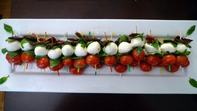 Snack form of Insalata Caprese with cherry tomatoes, Bocconcini, basil, and sun dried tomatoes… the perfect (healthy) party appetizer!