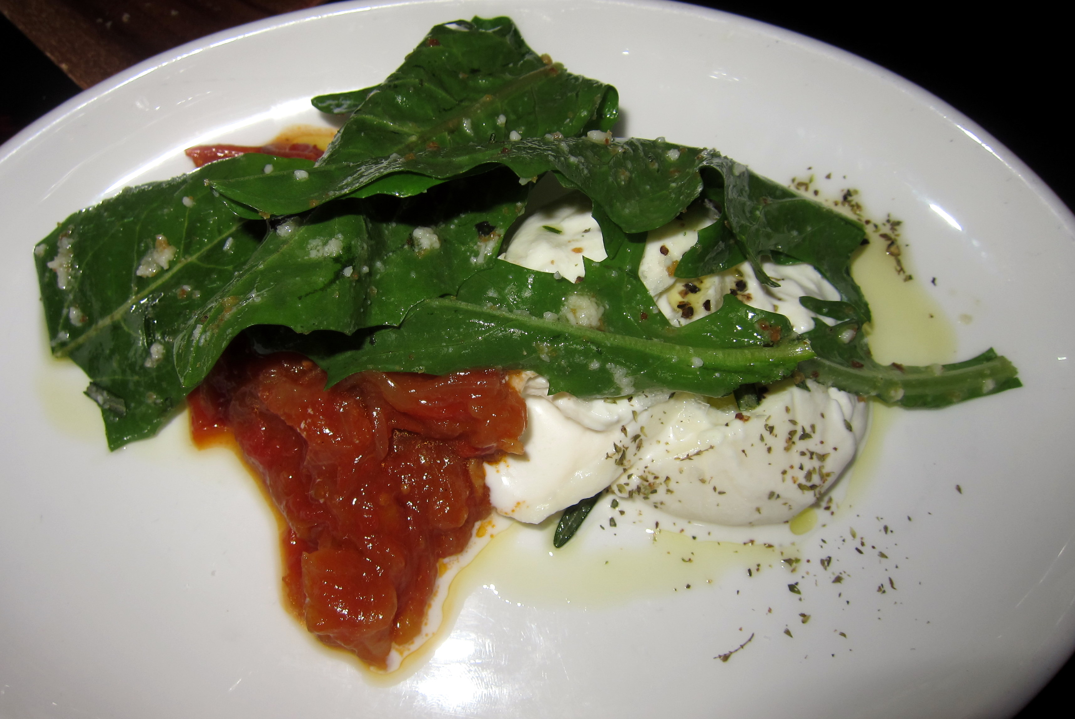 Burrata with Pepperonata Agrodolce, Dandelion and Rosemary