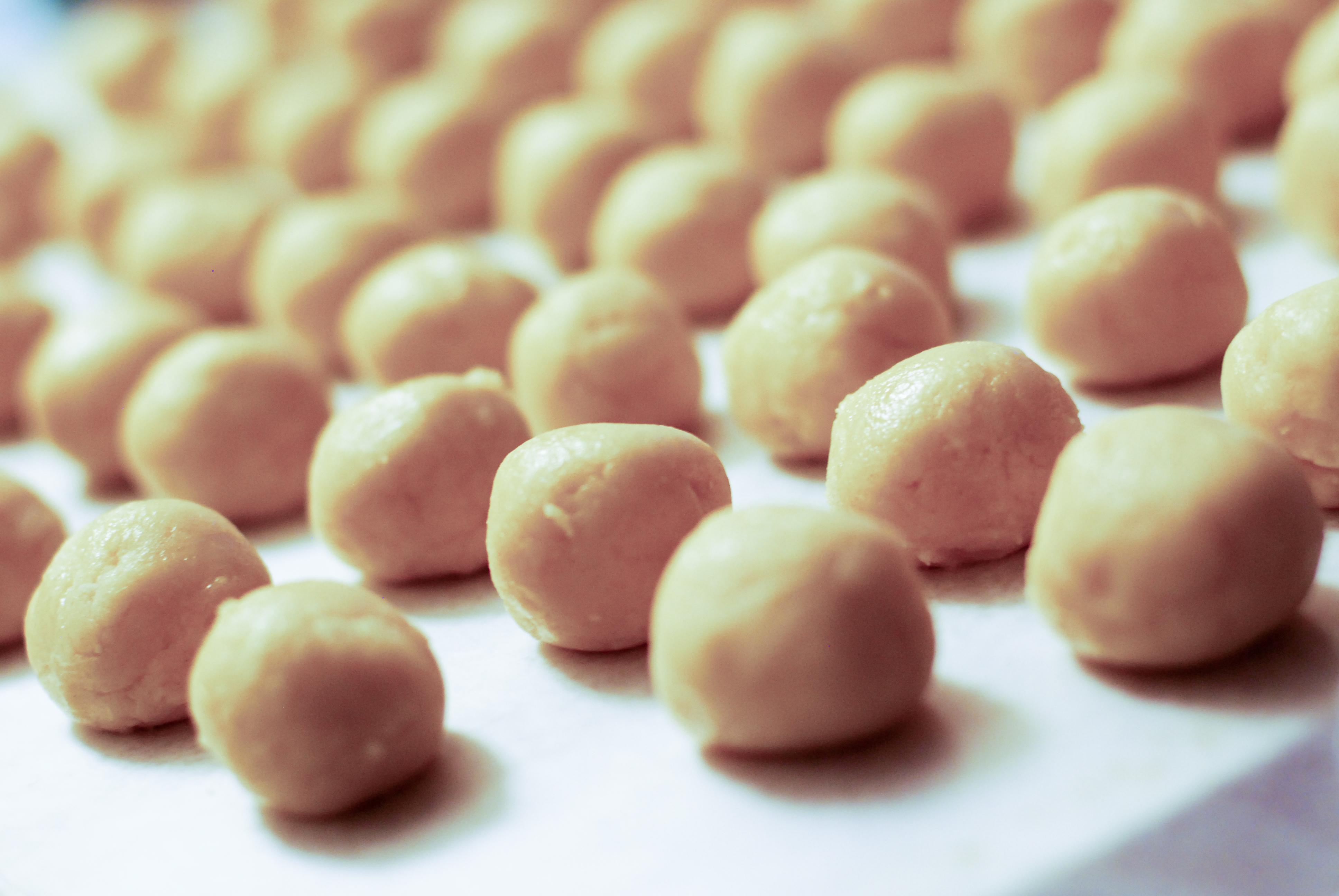 These cookies look just like regular snickerdoodles, but come with a yummy surprise in the middle. I found this recipe from Cookies and Cups and I loved the way they turned out. I made these cookies for a Christmas Cookie exchange party I went to last weekend and they were so good that I am making another batch to bring to work to share! There’s just a few extra steps to make these than a regular snickerdoodle recipe, but it’s totally worth it. =) Also, during the holidays, the key is efficiency (Especially with those long lines at the store right now). To save time, I made the cookie  dough balls ahead of time and put them in the freezer it until I’m ready to bake.