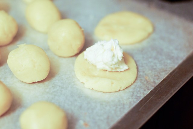 10. Place 1 tsp of the cream cheese mixture on top of one of the flattened dough disks. Then place the other flattened dough on top of the cream cheese. Pinch the edges together to seal.
