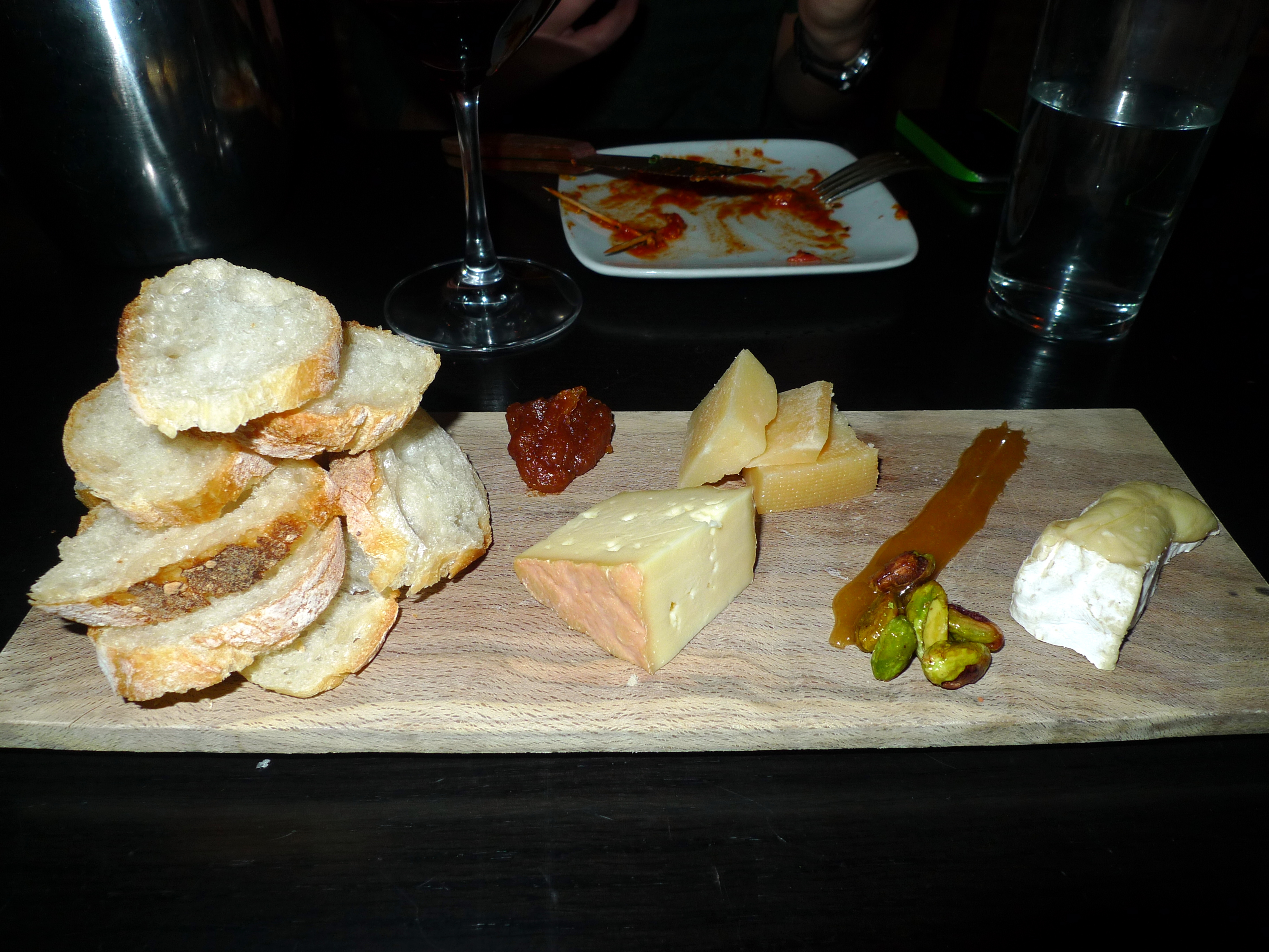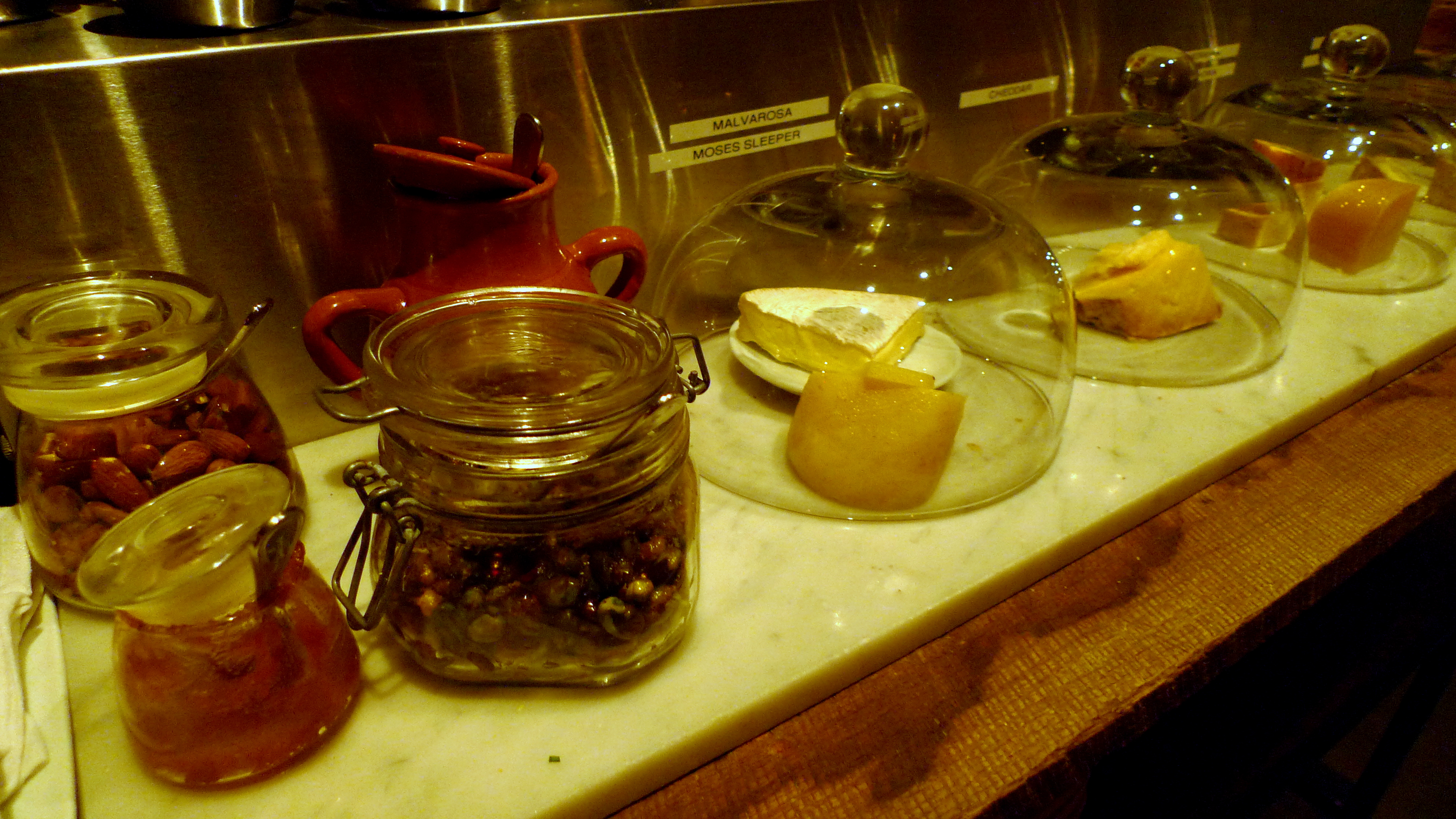 Just trust your server to put together a great flavor balanced cheese platter with accompanying sauces/condiments to complement your wine selections. I highly recommend the peach butter… with everyting… or on its own… The cheeses below are Adrahan, a semi soft, buttery Irish; Moses Sleeper, a triple-cream (ah divine creaminess!) cow creation from Vermont; and Ewephoria Gouda, a sheepsmilk cheese.