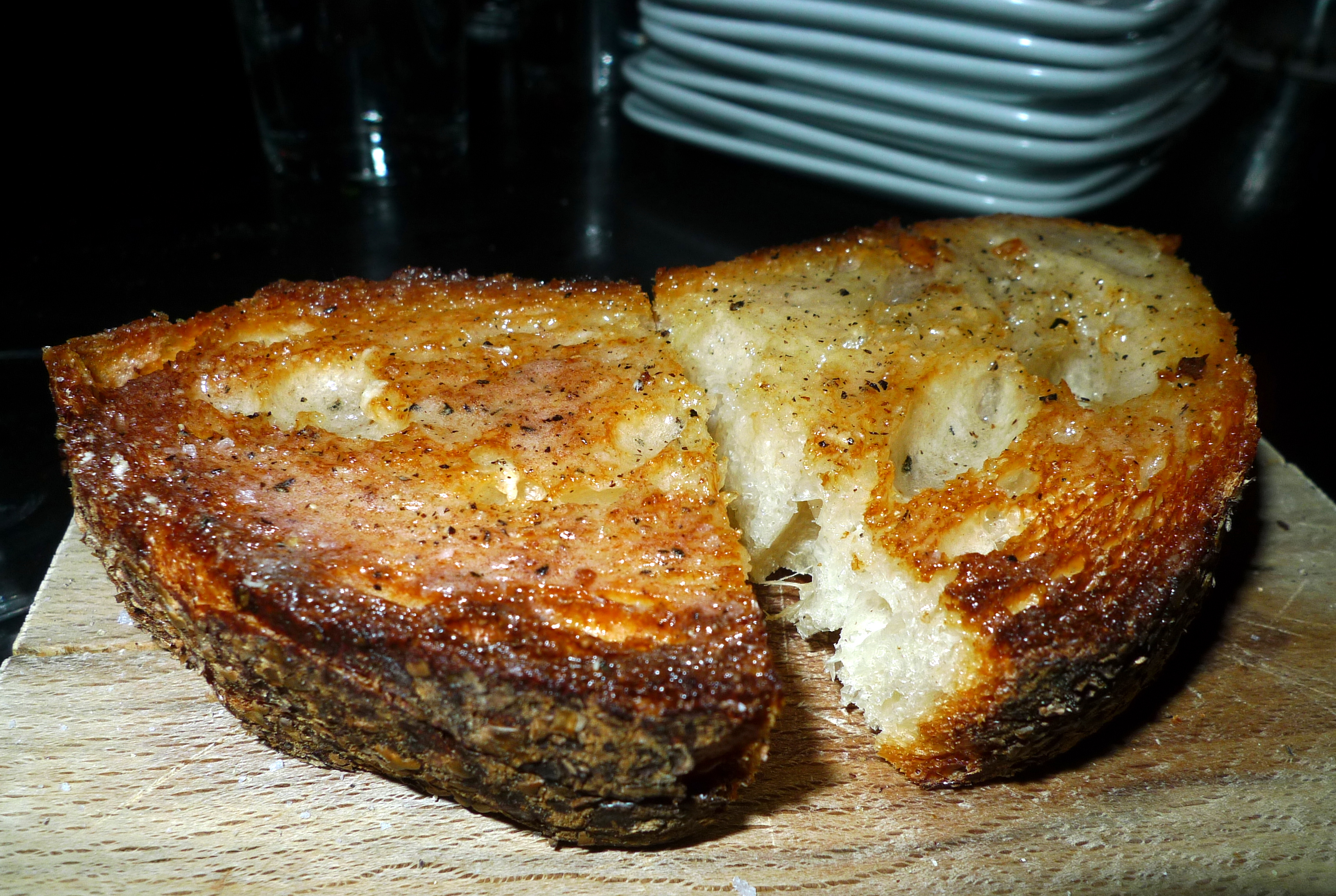 This is my favorite bruschetta! I love the thick and pulpy tomato and basil mixture with the semi-cooked egg on top… reminds me of my Tomato and Feta Baked Eggs on top of bread! Also, Nat eventually made this at home, so click here for the DIY recipe!