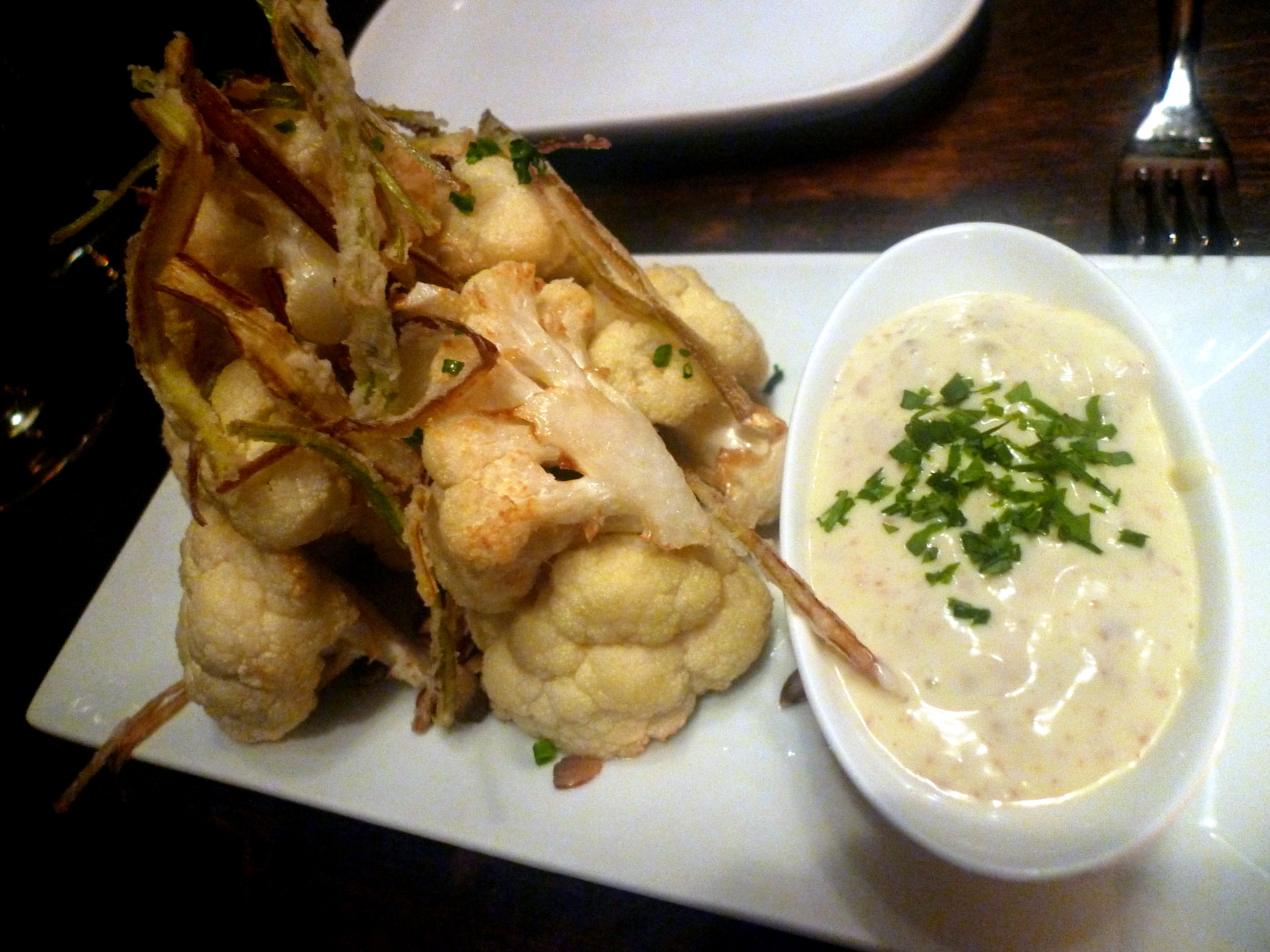 Coliflor: Fried Cauliflower with Hazelnut Aioli, Pumpkin Seeds and Fried Leeks