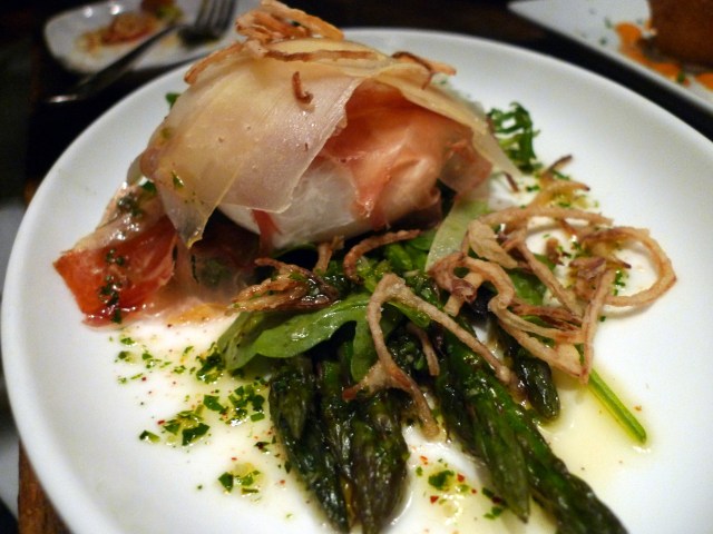 Mystery Item: Memory blanking… think was a poached egg wrapped in prosciutto with Parmesan shavings on a bed of asparagus? Kind of like this Thomas Keller dish: Roasted Asparagus with Poached Egg and Prosciutto