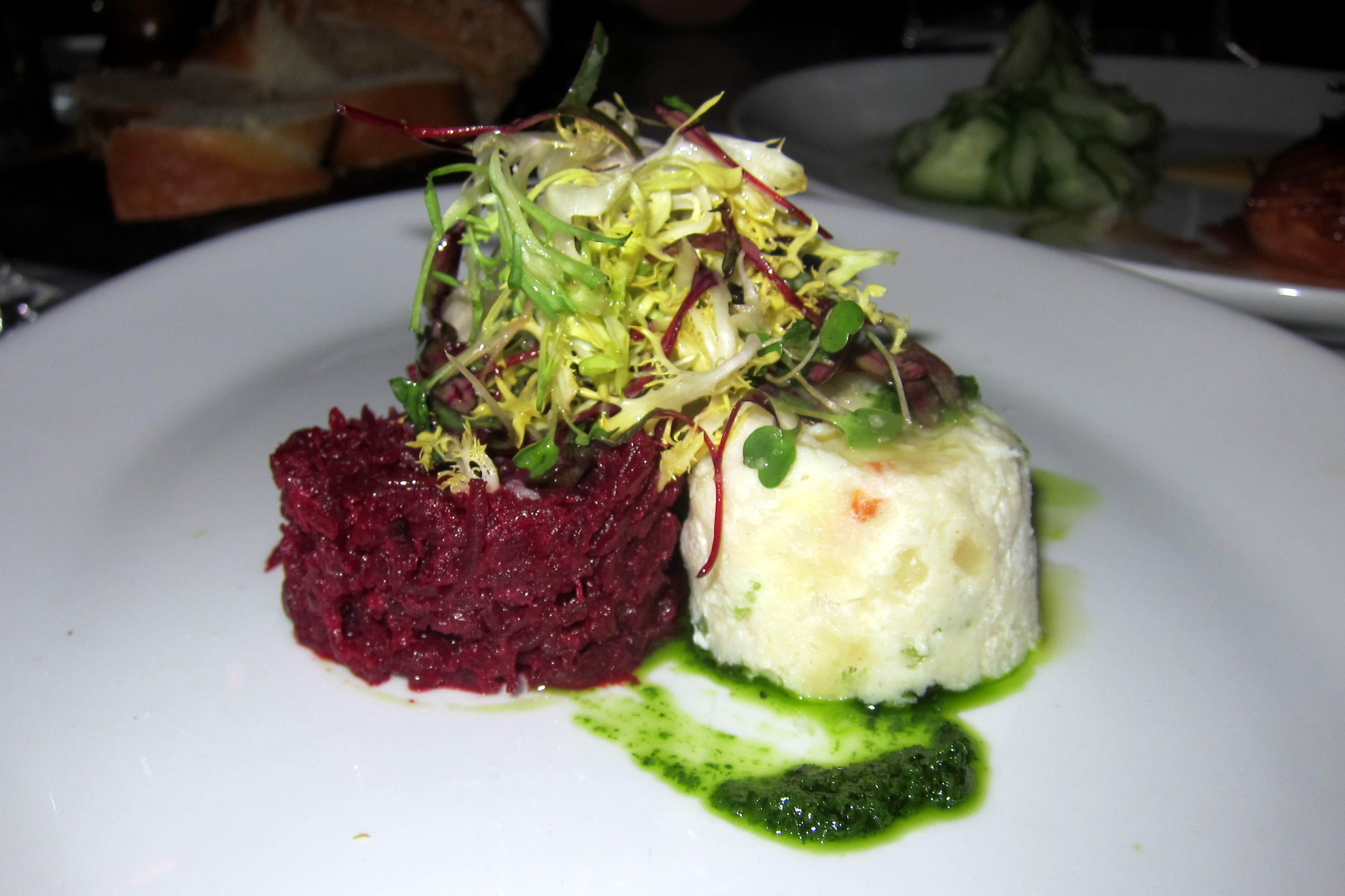 Not everyone likes gefilte fish, mostly because historically it’s been cooked from carp, pike or some of the cheaper fish. And it’s also a ground up fishball/fishcake, so it doesn’t sound particularly appetizing to most. However, I am not most people. My family happens to make Gefilte Fish (from halibut though) as the Thanksgiving centerpiece instead of a turkey every year.  So I was a huge fan of this halibut take on the traditional dish. The beet and horseradish tartare added a nice kick as well.