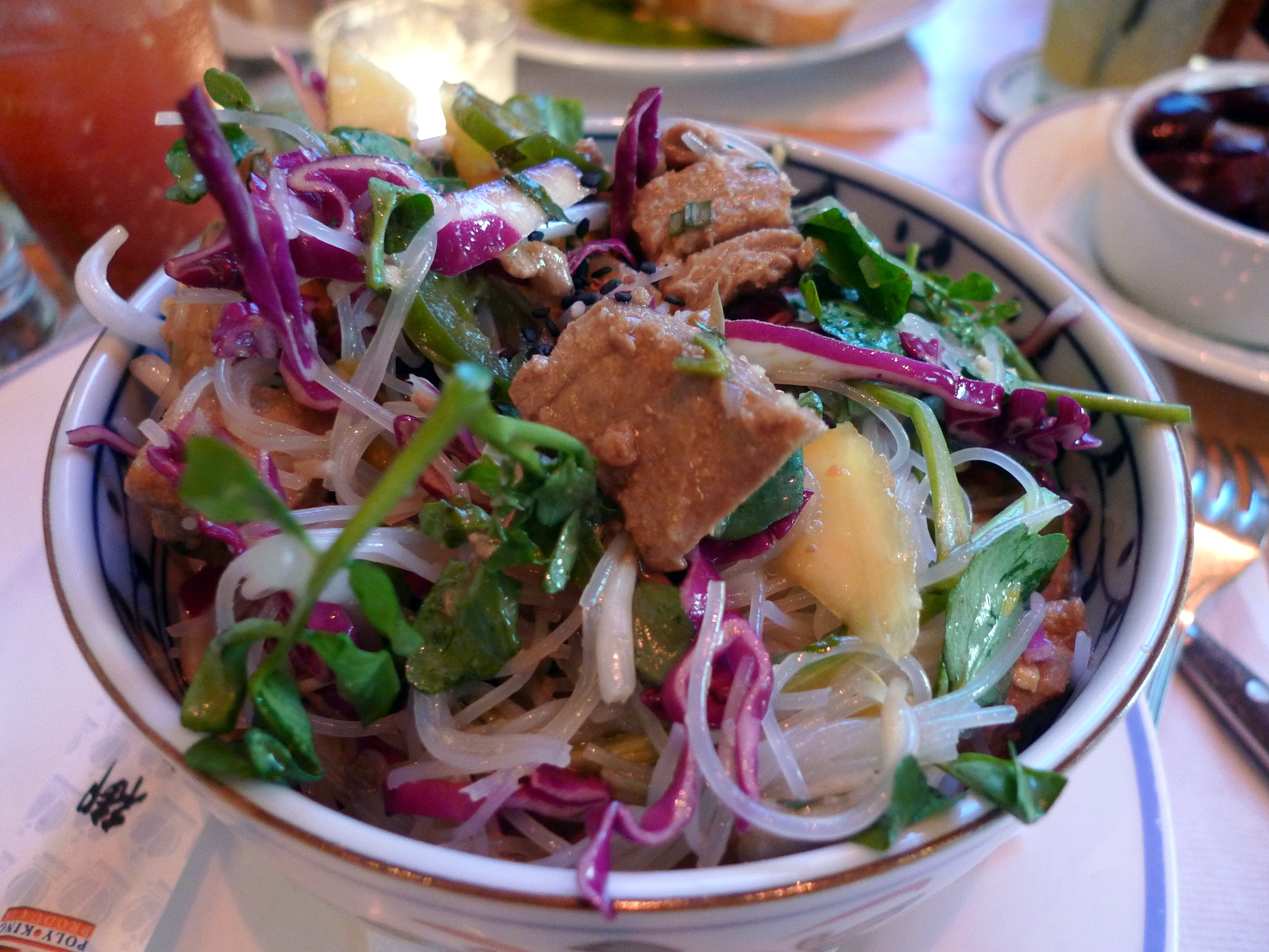 Yellowfin Tuna Ceviche with glass noodles, bean sprouts, red cabbage, mango, watercress and jalapeno in a soy, ginger and sesame dressing