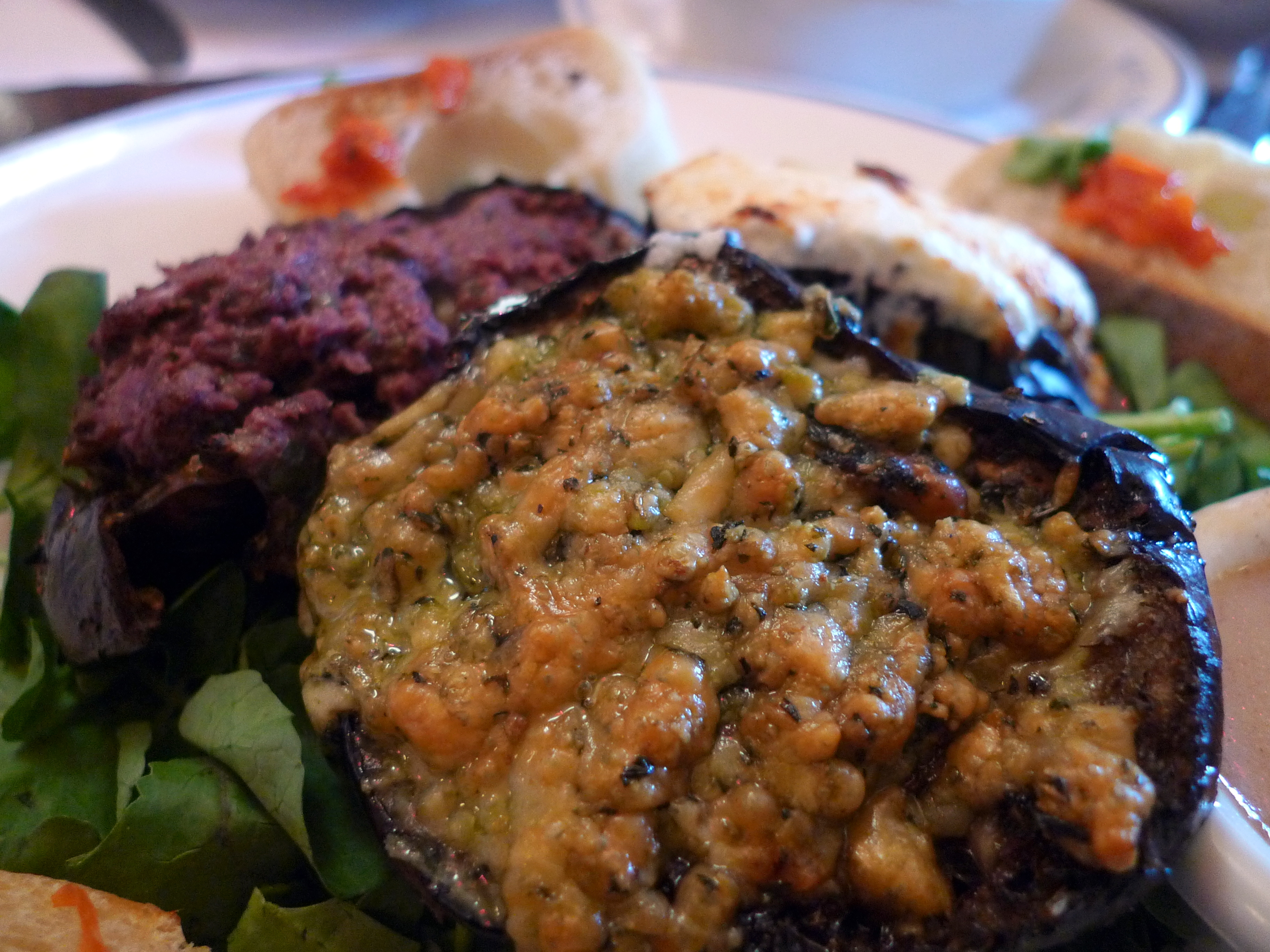 My favorite was the pesto topped grilled eggplant, which seemed to also had a thick layer of melted Parmesan cheese. The olive tapenade was a bit overpowering. I definitely am making this at home but think will try to mix the tapenade, goat cheese and pesto all together evenly for the fillings.