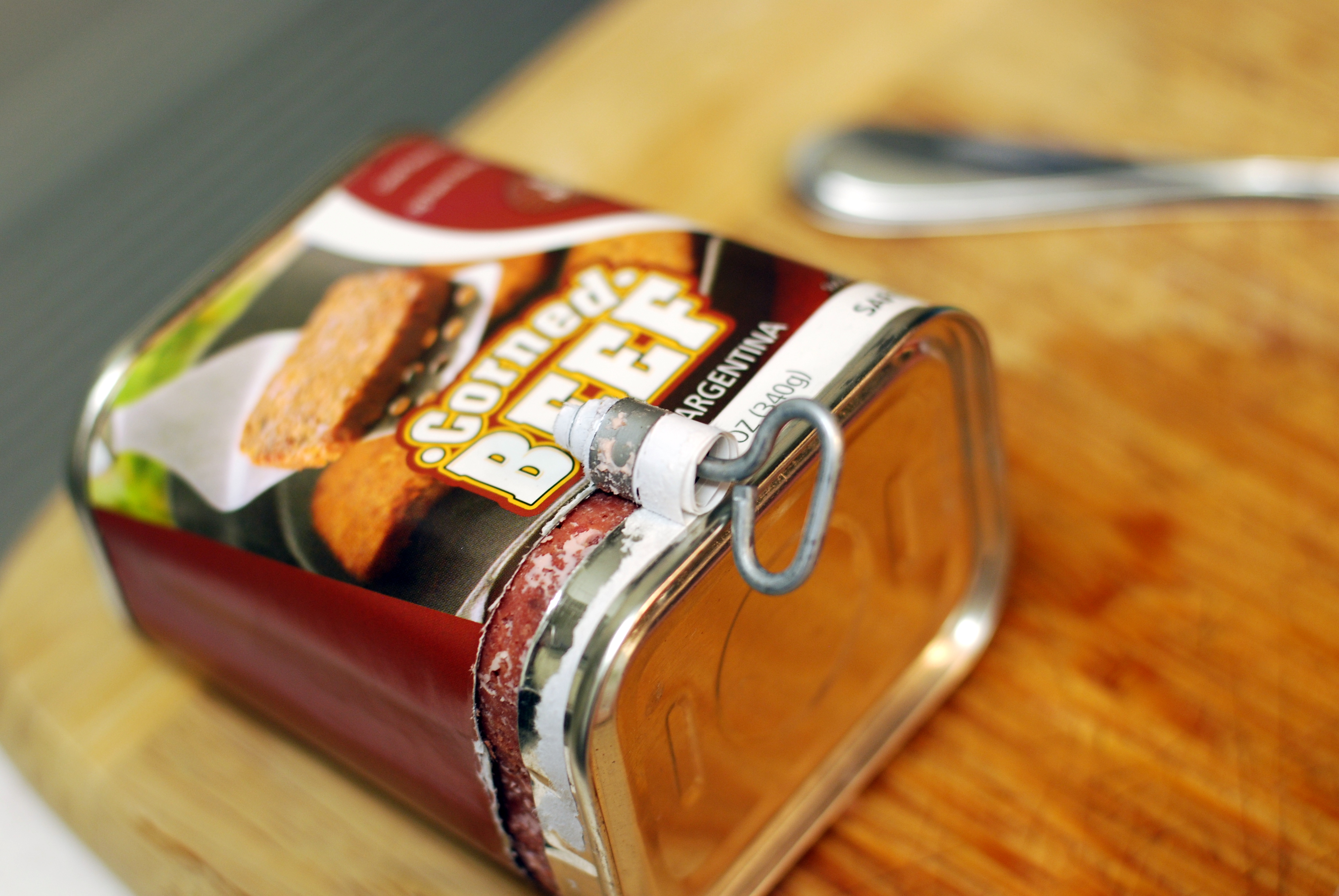 Hash is a dish that mashes meat, potatoes, and spices together to form a smooth consistency.  Onions and bell peppers can be added to the hash.  Corned beef hash especially gained popularity during and after WWII due to the rationing of fresh meat.  When I bought the canned corn beef from the grocery store, I was fascinated with the key you had to use to open it — I had never actually seen that before.  I’m ashamed to admit how long it took me to figure out how to open this thing… but don’t worry people, I have got it now!