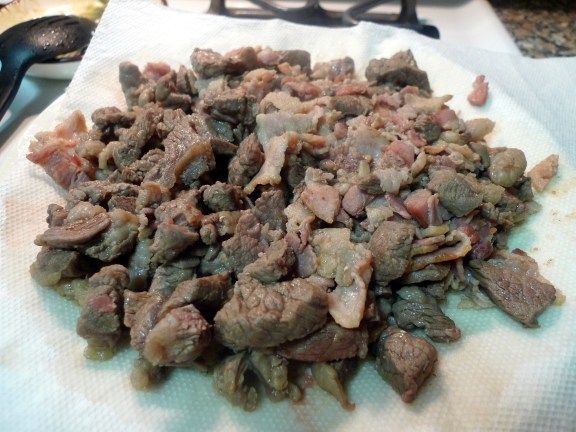 Preheat oven to 350°F. Place the bacon in a Dutch oven or stockpot and cook, stirring, over medium-high heat until the fat begins to render, about 3 minutes. Rendering the fat means that it is cooked over low heat and melts, separating from the meat. Add the beef and cook, stirring, until brown on all sides, about 5 minutes. Remove the meat from the pan with a slotted spoon and drain on paper towels.