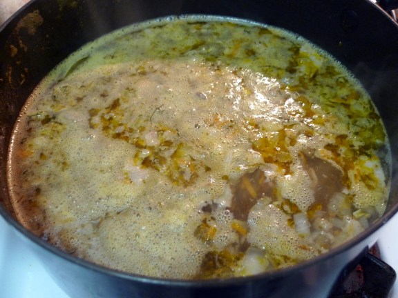 When the meat is tender and falling apart, add the beets, potatoes, and cabbage. Simmer over low heat for another 30 minutes.