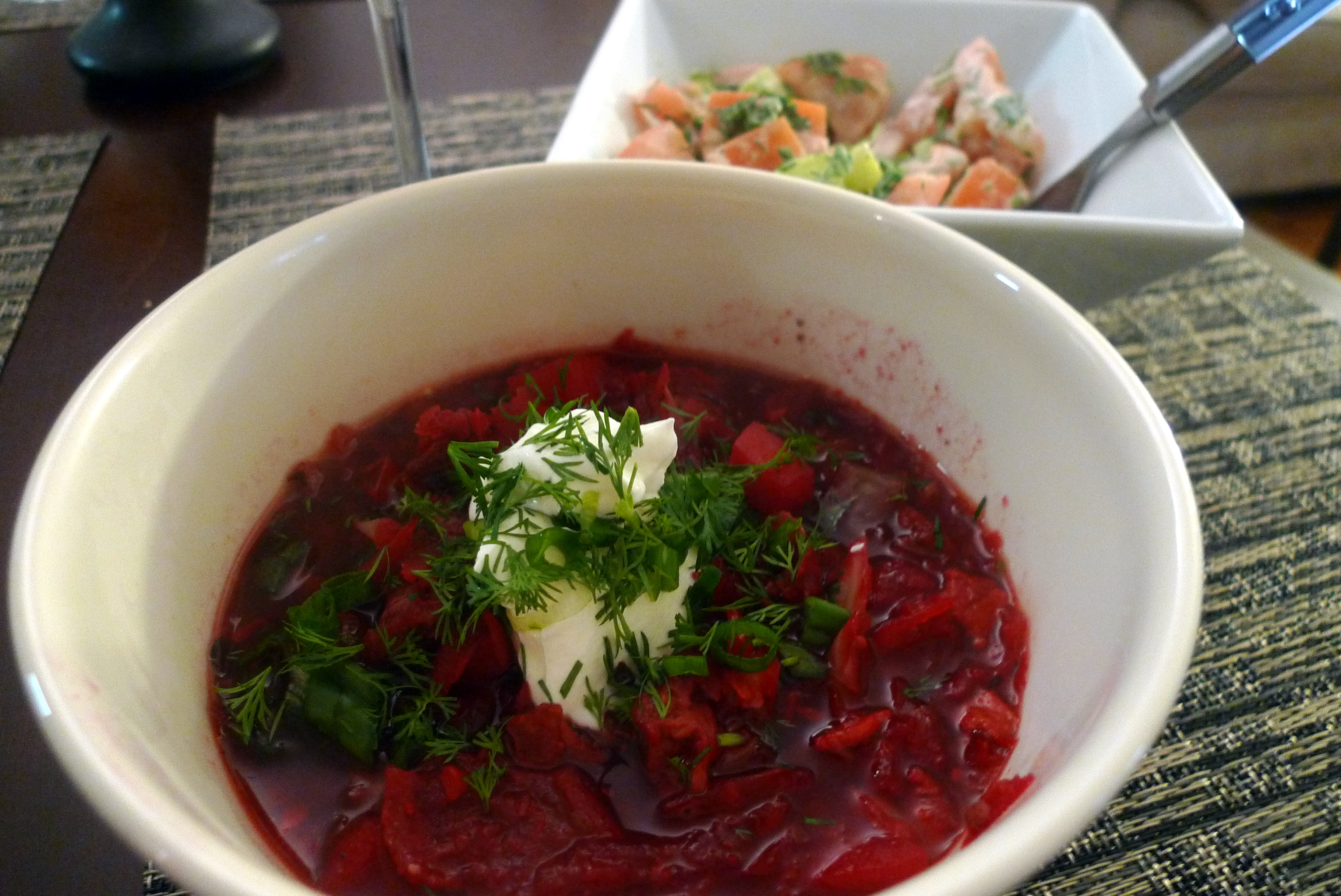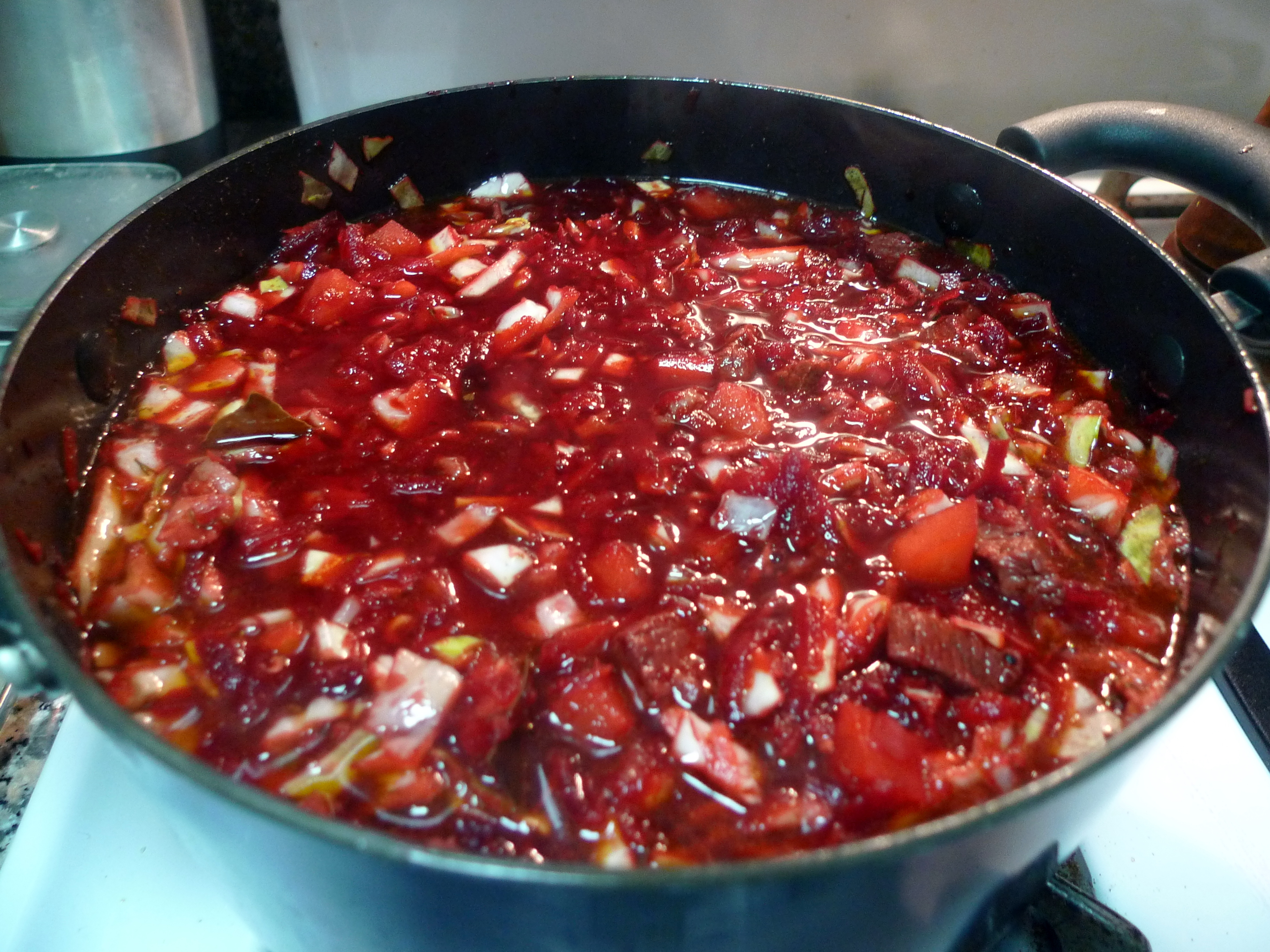 I’ve promised Jen to make this soup for a while. She really likes Holodnik, which is another beets-based Russian Soup, but one that is light and served cold. Borsch has meat, potatoes, cabbage while Holodnik has cucumbers and eggs. While both are beet-based, savory, and typically served with sour cream and garnished with dill and scallions, they are very different in their consistencies. Holodnik also is very quick to make, especially since I cheat by using jars of cooked beet soup. But Borsch made from scratch takes a lot of prep, so I took an entire Saturday afternoon to make it (well, by entire afternoon I mean about 3 hours).