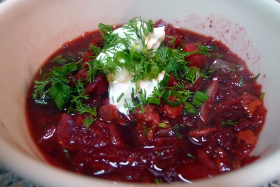 Borsch is a very traditional Russian beets-based stew. It is typically very heavy, savory, and perfect for cold winter nights. I think traditionally it came to be as a way to combine whatever vegetables were available with scraps of meat and fattiness into a hot stew. But I obviously had the option to use more choice ingredients.