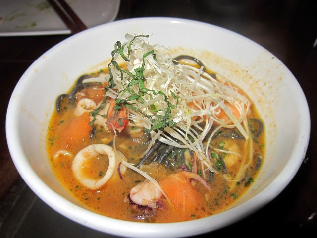Squid Ink Spaghettina- Monterey Squid, Shrimp, Garlic Tomato Compote, Red Curry, Lemongrass Dashi-Broth, Seaweed Butter, Enoki Mushrooms, Shiso