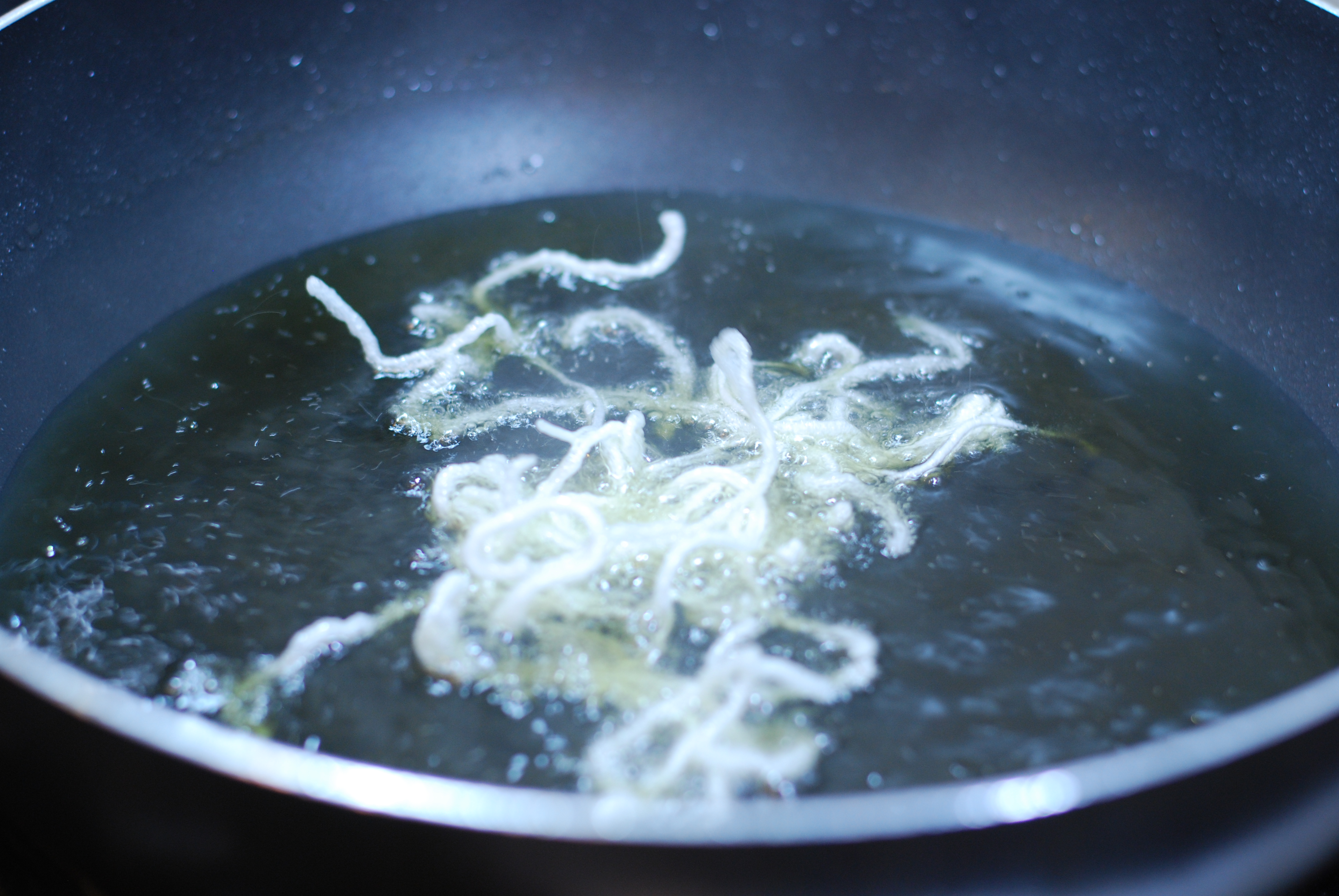 In a large wok, heat the 3 C of oil until very hot and deep fry the rice noodles for 3 seconds. Try not to put it all in at once or not all will puff up evenly. Depending on the size of your pot, work in batches.