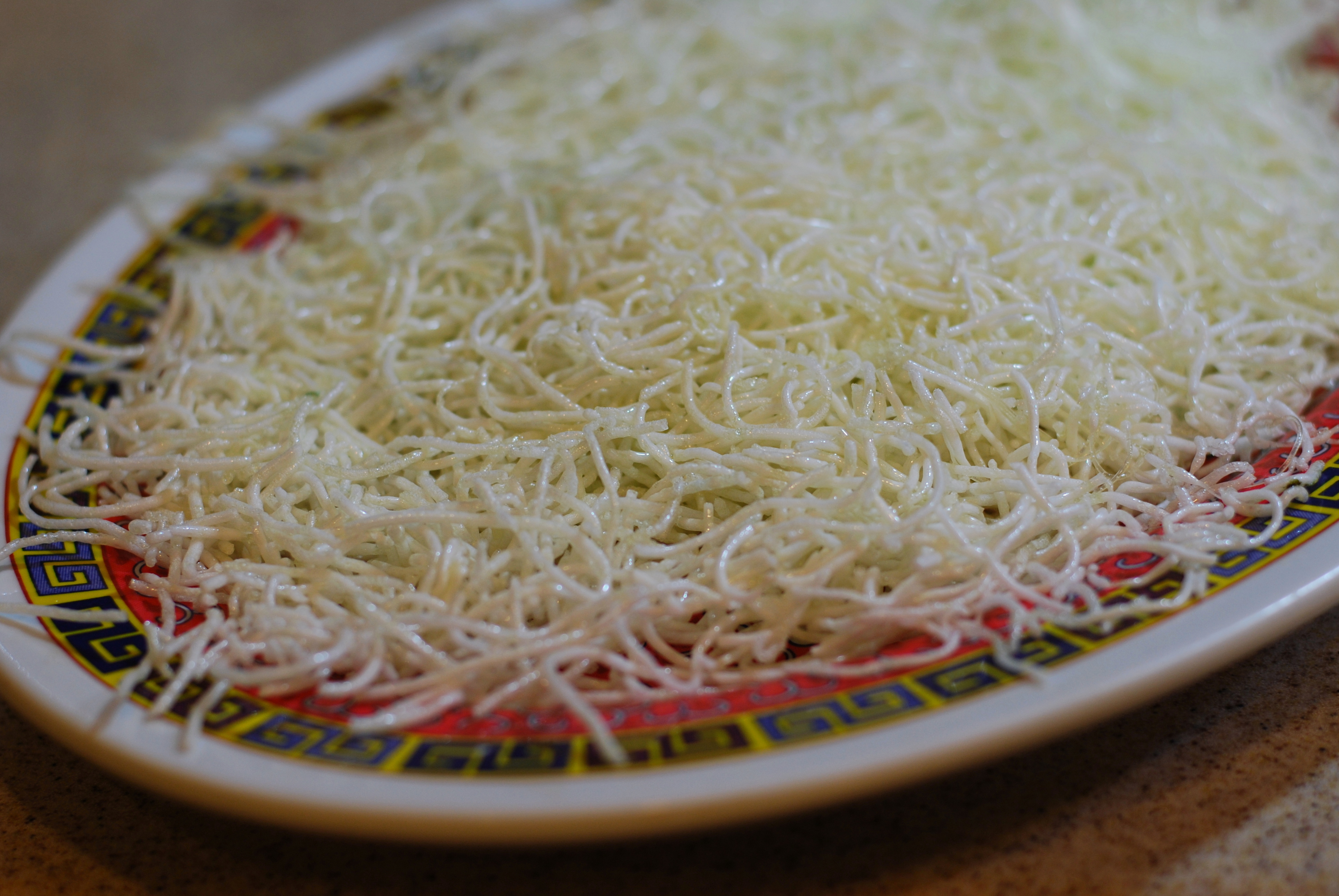Remove quickly and drain. Place the noodles on a large serving platter and smash into small bite-sized sticks. Set aside.