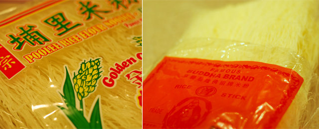 The recipe calls for rice noodles, although thinner rice sticks I think work just as well. If anything, I prefer thinner rice sticks as they are much more delicate and crispier. This dish needs to be served immediately otherwise the fried rice noodles will get soggy.
