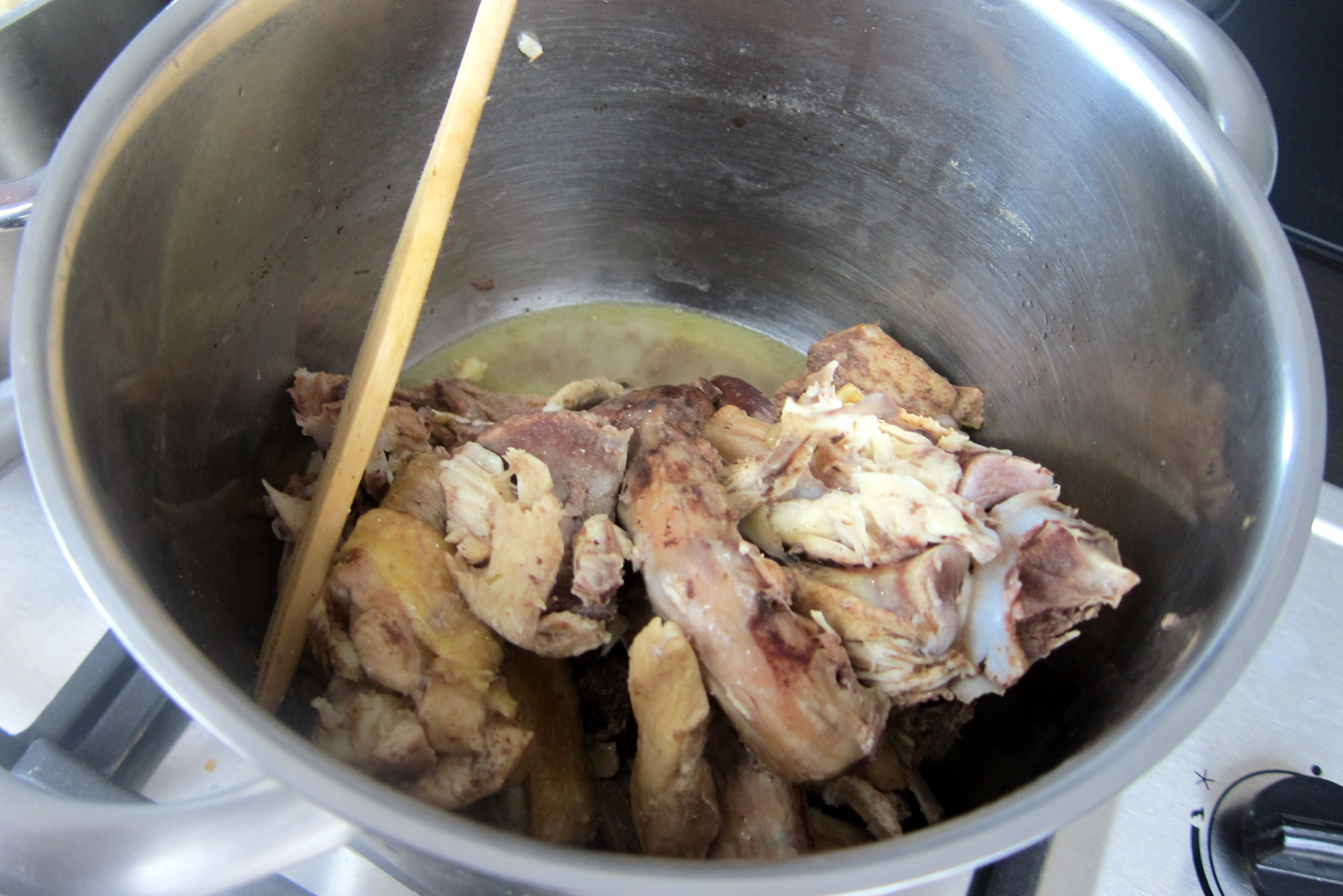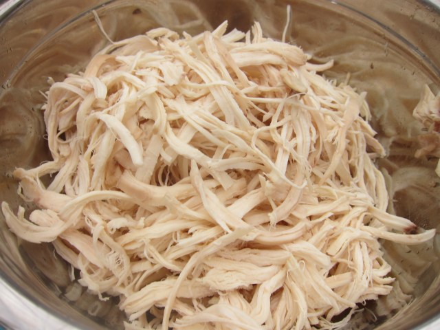 Take the cooked chicken with your hands and separate along its fibers so that you get thin threads.