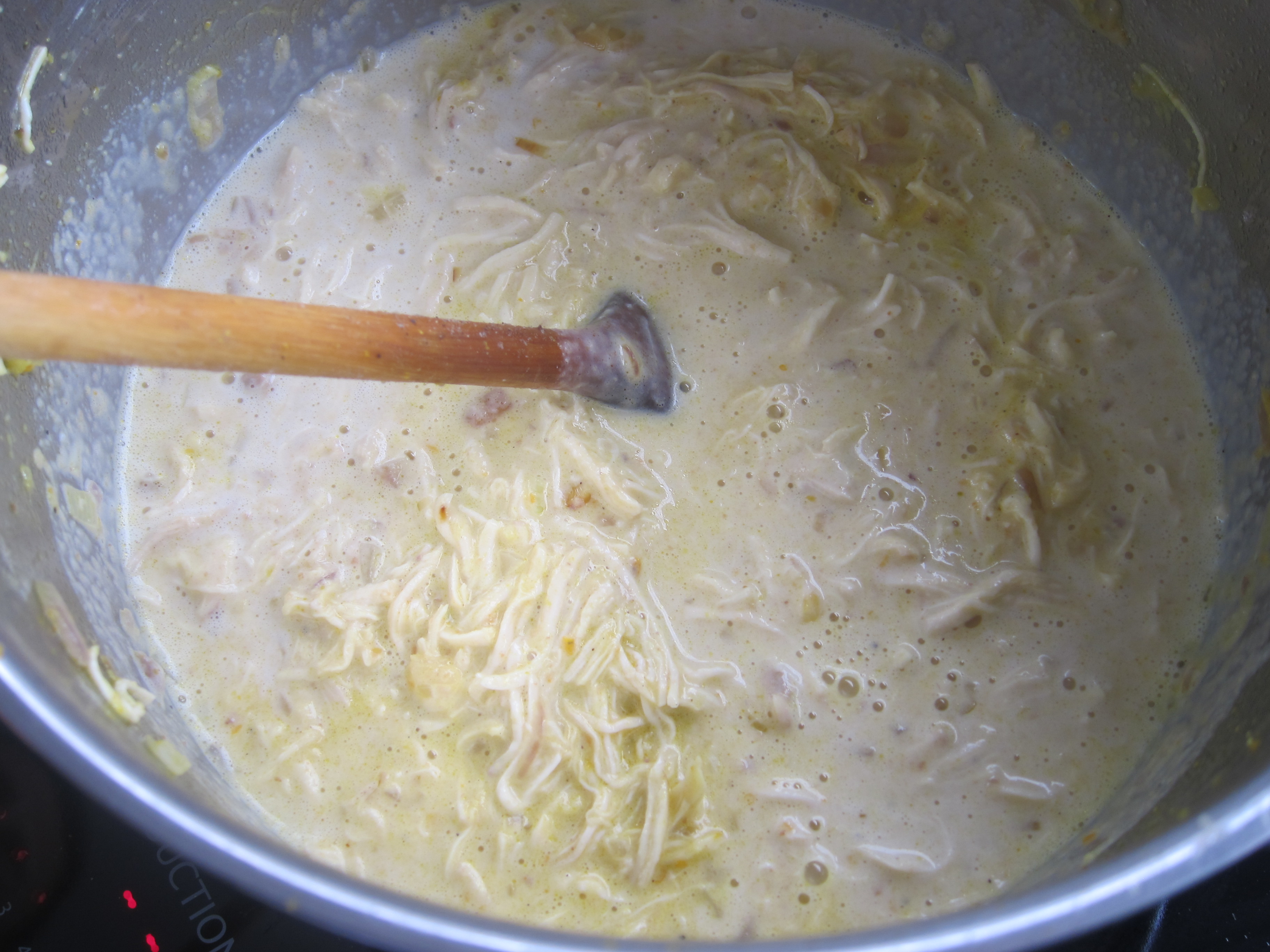 Heat some oil in a saucepan and fry the onion, garlic, and add the chili paste. Add the chicken to the pan and sauté, then add the liquid from the blender and ground Parmesan.