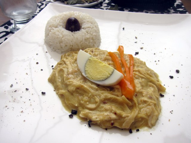 Aji De Gallina is a traditional pulled chicken dish with aji sauce that we prepared as the main entrée in the Peruvian Cooking Class in Lima. It is a stew of chicken strips in a cheese sauce served with rice and boiled egg. Because of time constraints, our instructor pre-cooked the chicken itself prior to our arrival. Chef Yurac basically boiled it for 20 minutes or so in stock and then let it rest until it was time for us to shred it into strips and cook it. Even with the added time, this recipe is still very manageable especially if you have a couple of people helping out to dice/shred/stir.