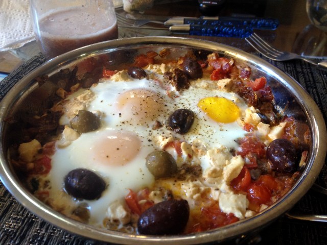 I had some leftover keftas sitting in the fridge for a couple days, and so Natalya decided to jazz them up a bit by incorporating them in a baked eggs dish for Saturday brunch. She made a variation of our favorite Tomato and Feta Baked Eggs by adding some chopped up keftas and olives to the tomato and feta mixture. It was delicious!