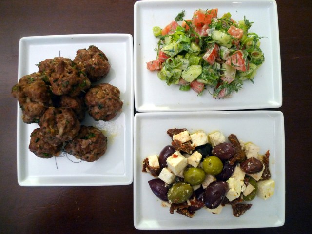 My first batch I left “naked” and enjoyed the baked keftas without any sauce. I loved how savory and sweet the meatballs were, with a hint of nutty pepper. I served the naked keftas as a meze dish along with other Mediterranean small plates, including some hummus and Marinated Feta with Olives. I also made some Russian Salat, which isn’t exactly Mediterranean but the creamy cucumber, tomato and scallion salad seemed to make a whole lot of sense in my meze platter. Plus, Natalya has made Russian Côtelettes with the salat before, so figured why not a Moroccan meatball? I am always for fusion cuisine.