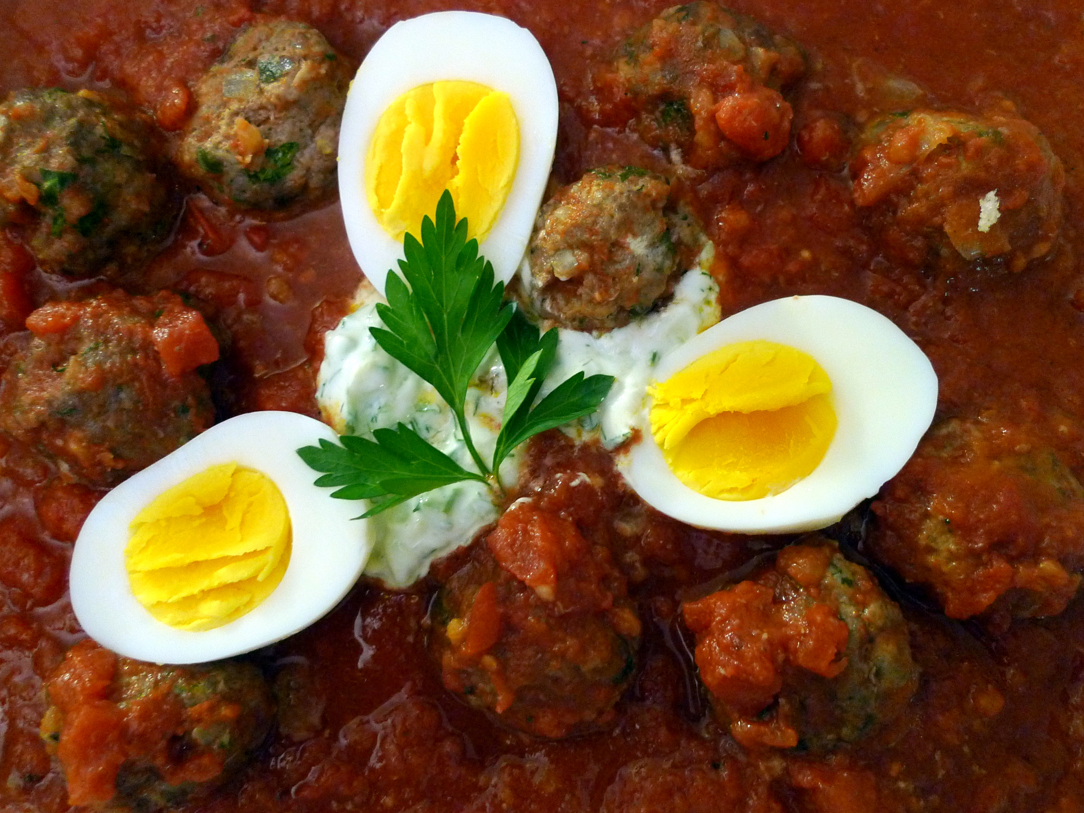 I modeled my preparation of this dish after Cafe Gitane’s Spicy organic meatballs in turmeric tomato sauce with boiled egg, cucumber-yogurt and cilantro. I ladled a hefty serving of the keftas in the tomato sauce into a shallow bowl. I made a fresh batch of tzatziki to spoon into the sauce, placed a few hard-boiled egg halves around the dish, and finally piled some fresh cilantro sprigs on top. Voilà! Enjoy with some warm, crusty bread.