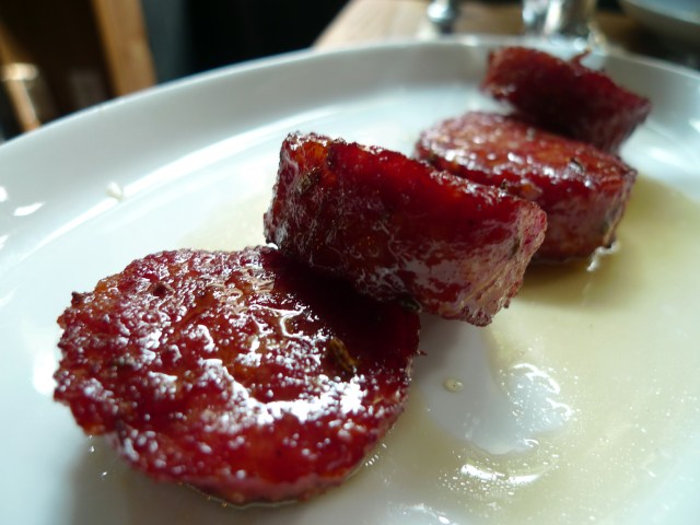This was described as “porkcake” which is pretty accurate. There’s all sorts of pig parts mixed together in “cake” form. Clearly a lot denser than a crabcake, but not as thick as a terrine. The seasoning was intriguing (was is cumin or coriander?) and I loved the smoked onion remoulade.