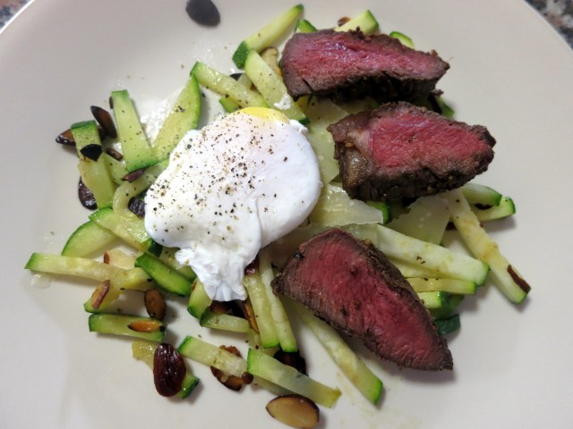 If you have leftovers, I suggest you make a version of the classic Steak and Eggs by throwing a poached egg on the bed of Zucchini and Almonds surrounded by slices of the filet mignon.