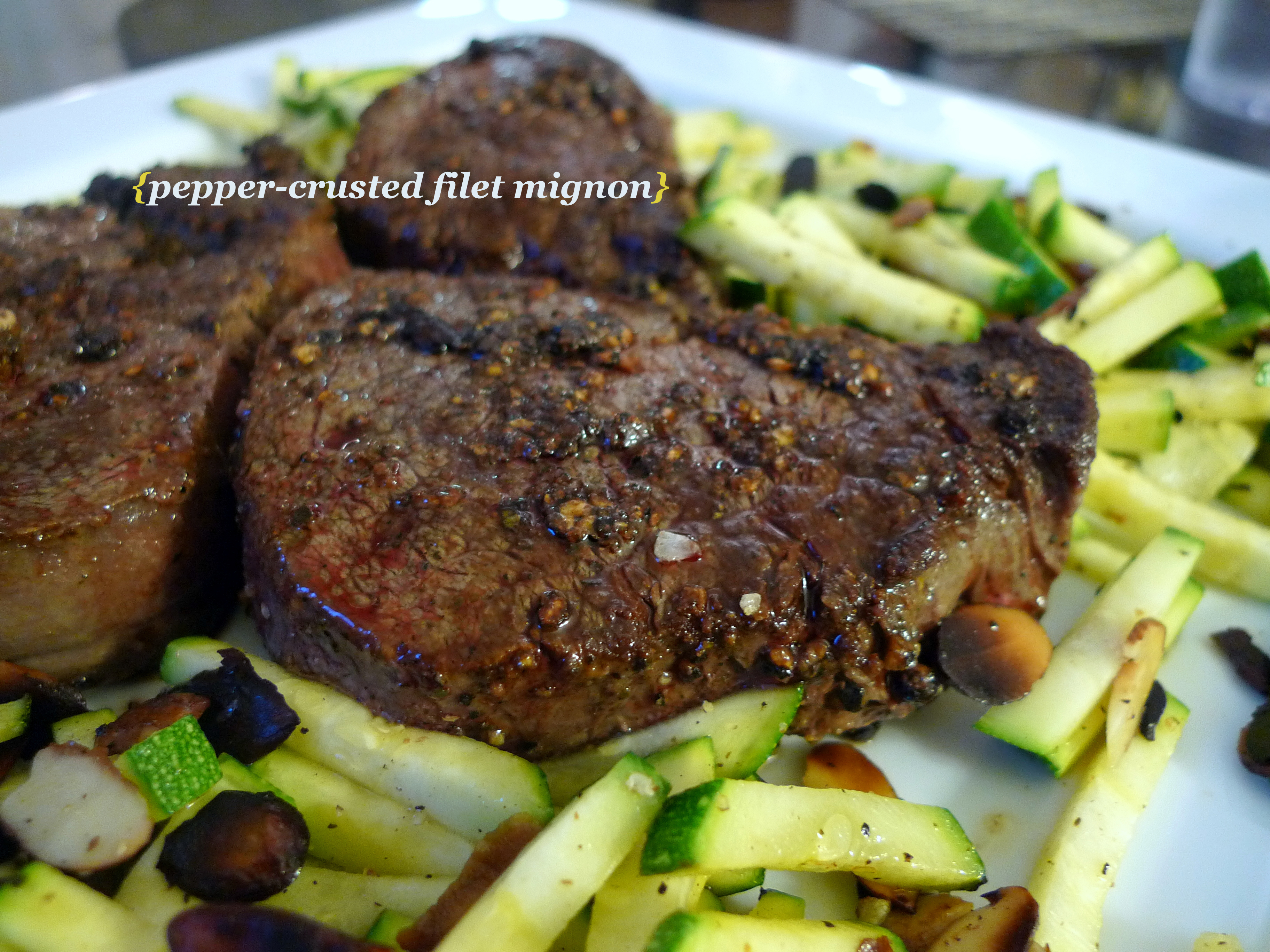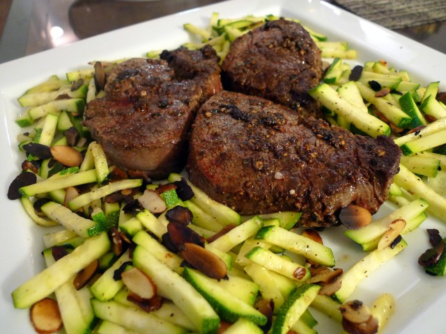 I know Jen and I often talk about making easy meals and simple recipes. Other times we obviously take days to marinade, brine, experiment, etc. In the realm of quick and easy, this recipe rules all. Honestly this filet mignon, paired with Zucchini and Almonds is the epitomy of fast cooking and deliciousness. The meat requires no marinating, just a simple coating of pepper and salt. It cooks in under 10 minutes and is absolutely juicy and tender. The side dish of zucchini cooks in under 5minutes and also requires minimal preparation time, so is a perfect complement to the filet. And despite the ease of cooking, the meal has an air of fanciness and looks complicated.